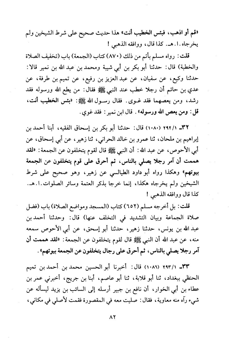32 - 1/ 292 (1080) قال: حدثنا أبو بكر بن إسحاق الفقيه، أبنا أحمد بن إبراهيم بن ملحان، ثنا عمرو بن خالد الحراني، ثنا زهير، عن أبي إسحاق، عن أبي الأحوص، عن عبد الله: أن النبي - صلى الله عليه وسلم - قال لقوم يتخلفون عن الجمعة: "لقد هممت أن آمر رجلا يصلي بالناس، ثم أحرق على قوم يتخلفون عن الجمعة بيوتهم" وهكذا رواه أبو داود الطيالسي عن زهير، وهو صحيح على شرط الشيخين ولم يخرجاه هكذا، إنما خرجا بذكر العتمة وسائر الصلوات. ا. هـ. كذا قال ووافقه الذهبي!