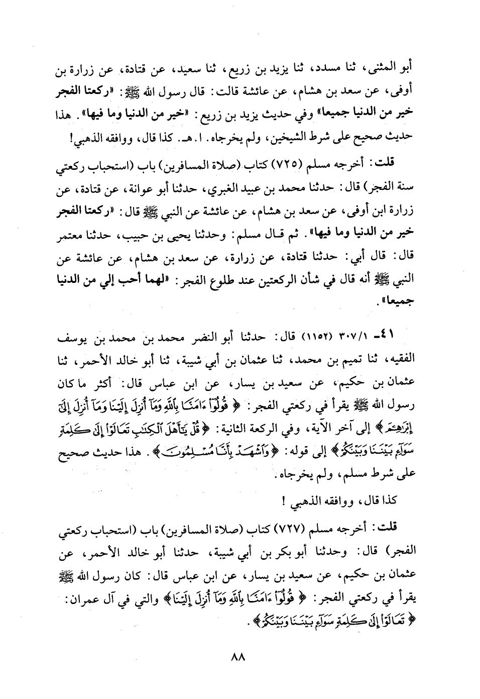 أبو المثنى، ثنا مسدد، ثنا يزيد بن زريع، ثنا سعيد، عن قتادة، عن زرارة بن أوفى، عن سعد بن هشام، عن عائشة قالت: قال رسول الله - صلى الله عليه وسلم -: "ركعتا الفجر خير من الدنيا جميعا" وفي حديث يزيد بن زريع: "خير من الدنيا وما فيها". هذا حديث صحيح على شرط الشيخين، ولم يخرجاه. ا. هـ. كذا قال، ووافقه الذهبي!