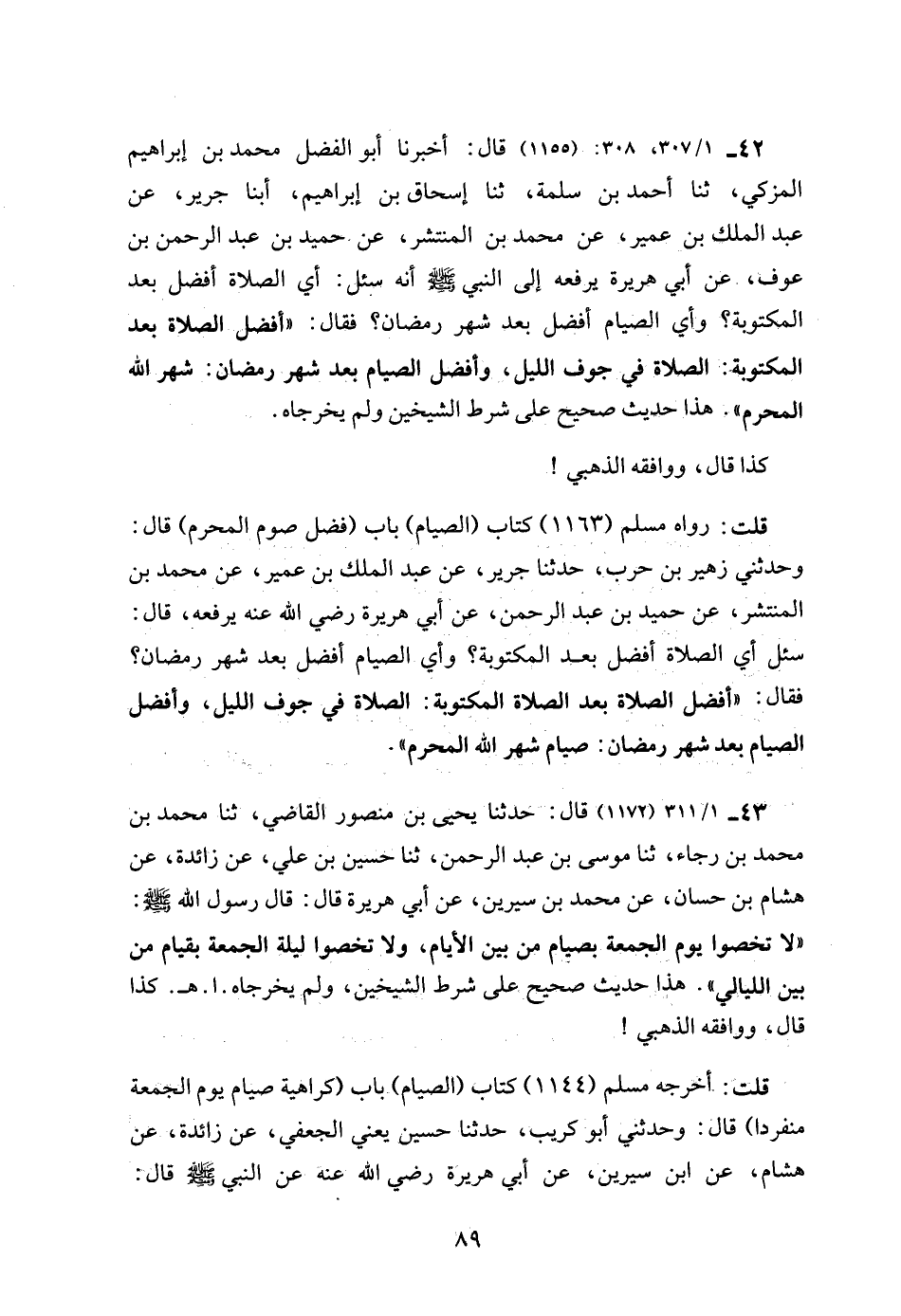 42 - 1/ 307، 308: (1155) قال: أخبرنا أبو الفضل محمد بن إبراهيم المزكي، ثنا أحمد بن سلمة، ثنا إسحاق بن إبراهيم، أبنا جرير، عن عبد الملك بن عمير، عن محمد بن المنتشر، عن حميد بن عبد الرحمن بن عوف، عن أبي هريرة يرفعه إلى النبي - صلى الله عليه وسلم - أنه سئل: أي الصلاة أفضل بعد المكتوبة؟ وأي الصيام أفضل بعد شهر رمضان؟ فقال: "أفضل الصلاة بعد المكتوبة: الصلاة في جوف الليل، وأفضل الصيام بعد شهر رمضان: شهر الله المحرم". هذا حديث صحيح على شرط الشيخين ولم يخرجاه.
