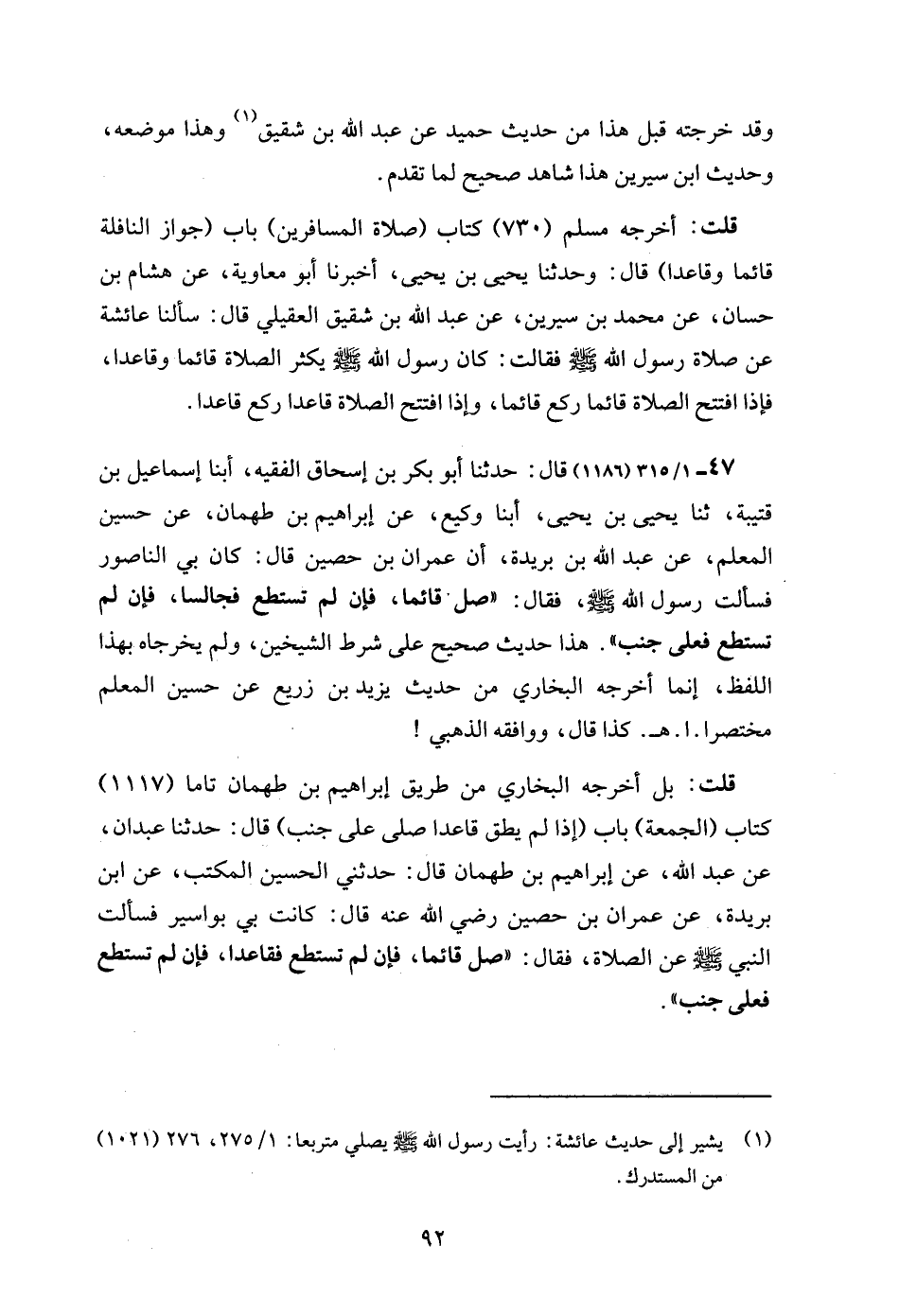 47 - 1/ 315 (1186) قال: حدثنا أبو بكر بن إسحاق الفقيه، أبنا إسماعيل بن قتيبة، ثنا يحيى بن يحيى، أبنا وكيع، عن إبراهيم بن طهمان، عن حسين المعلم، عن عبد الله بن بريدة، أن عمران بن حصين قال: كان بي الناصور فسألت رسول الله - صلى الله عليه وسلم -، فقال: "صل قائما، فإن لم تستطع فجالسا، فإن لم تستطع فعلى جنب". هذا حديث صحيح على شرط الشيخين، ولم يخرجاه بهذا اللفظ، إنما أخرجه البخاري من حديث يزيد بن زريع عن حسين المعلم مختصرا. ا. هـ. كذا قال، ووافقه الذهبي!
