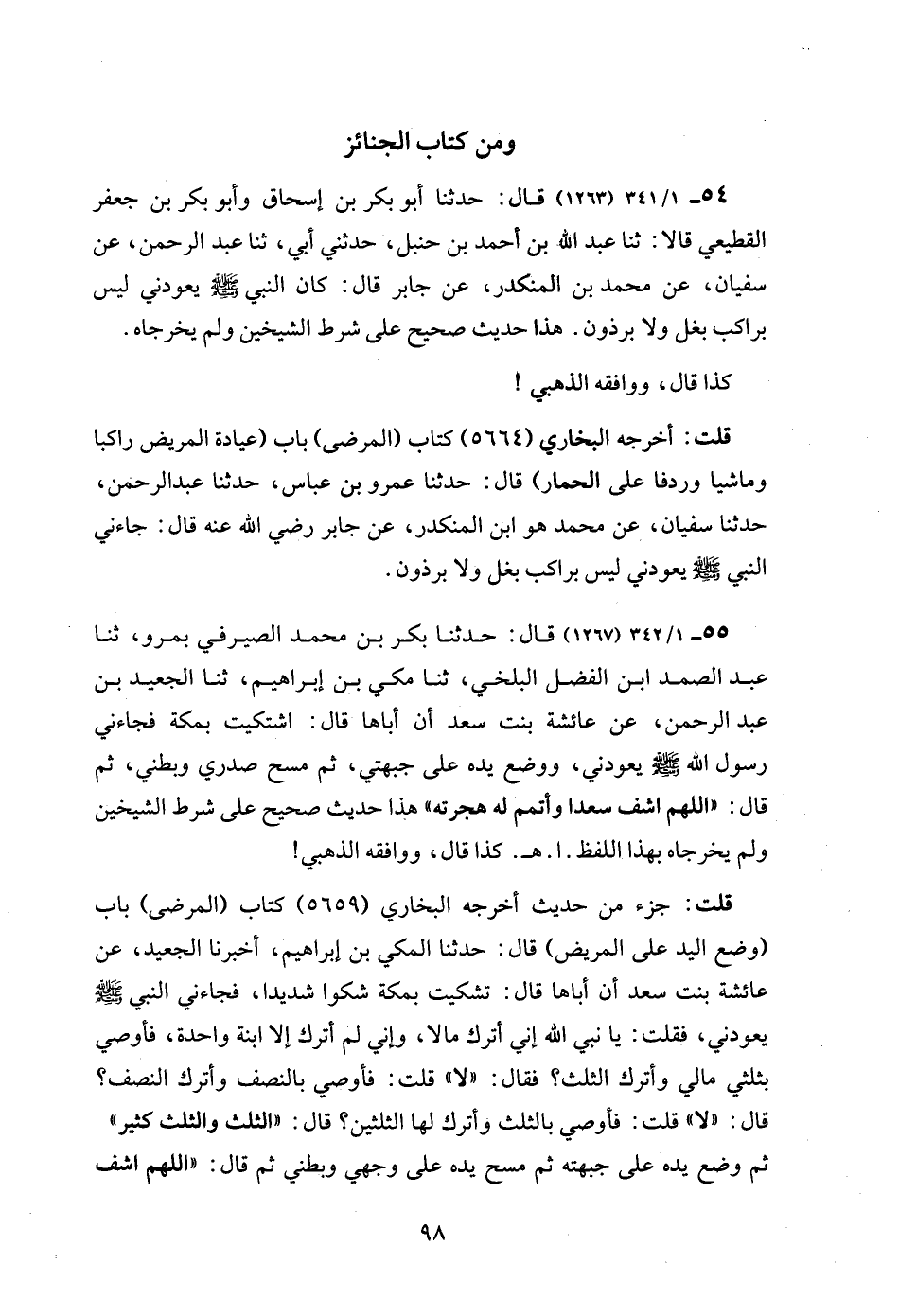 54 - 1/ 341 (1263) قال: حدثنا أبو بكر بن إسحاق وأبو بكر بن جعفر القطيعي قالا: ثنا عبد الله بن أحمد بن حنبل، حدثني أبي، ثنا عبد الرحمن، عن سفيان، عن محمد بن المنكدر، عن جابر قال: كان النبي - صلى الله عليه وسلم - يعودني ليس براكب بغل ولا برذون. هذا حديث صحيح على شرط الشيخين ولم يخرجاه.
