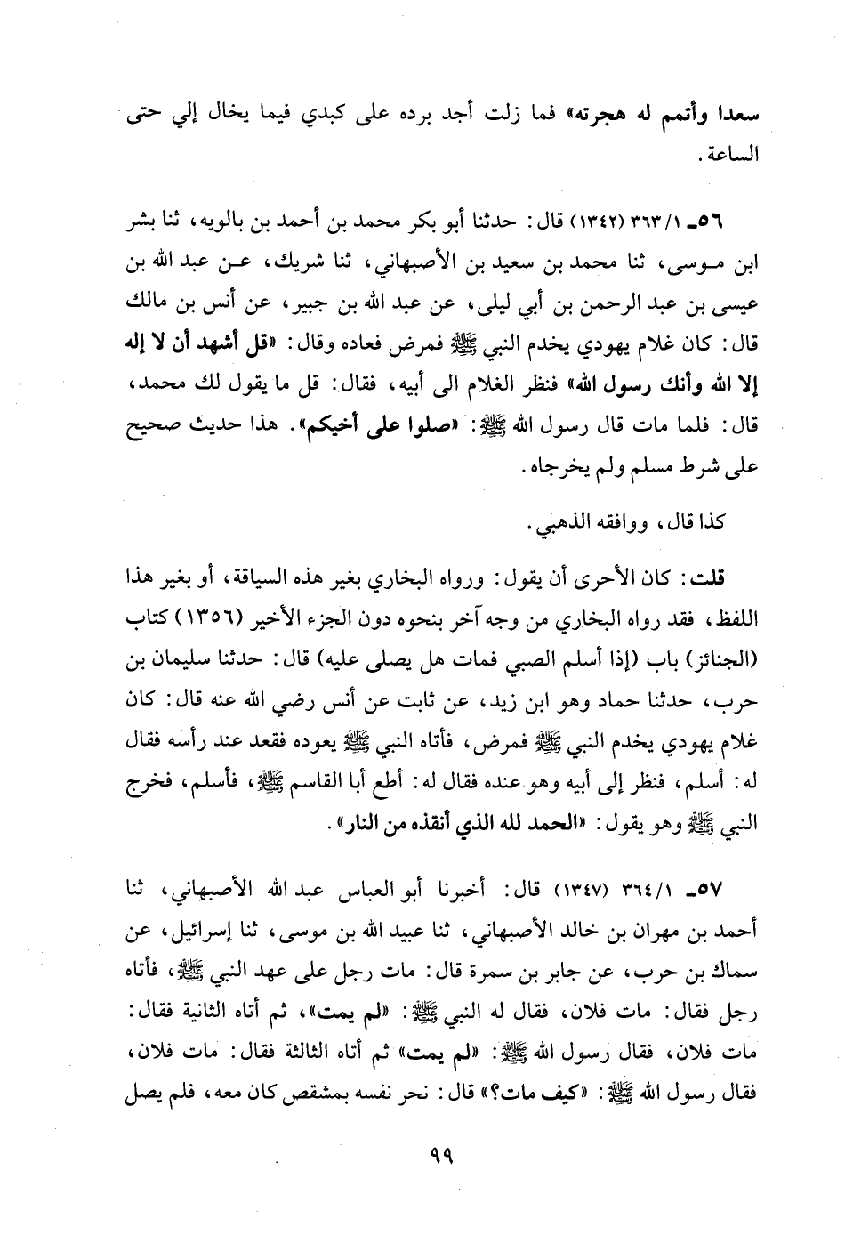 56 - 1/ 363 (1342) قال: حدثنا أبو بكر محمد بن أحمد بن بالويه، ثنا بشر ابن موسى، ثنا محمد بن سعيد بن الأصبهاني، ثنا شريك، عن عبد الله بن عيسى بن عبد الرحمن بن أبي ليلى, عن عبد الله بن جبير، عن أنس بن مالك قال: كان غلام يهودي يخدم النبي - صلى الله عليه وسلم - فمرض فعاده وقال: "قل أشهد أن لا إله إلا الله وأنك رسول الله" فنظر الغلام الى أبيه، فقال: قل ما يقول لك محمد، قال: فلما مات قال رسول الله - صلى الله عليه وسلم -: "صلوا على أخيكم". هذا حديث صحيح على شرط مسلم ولم يخرجاه.