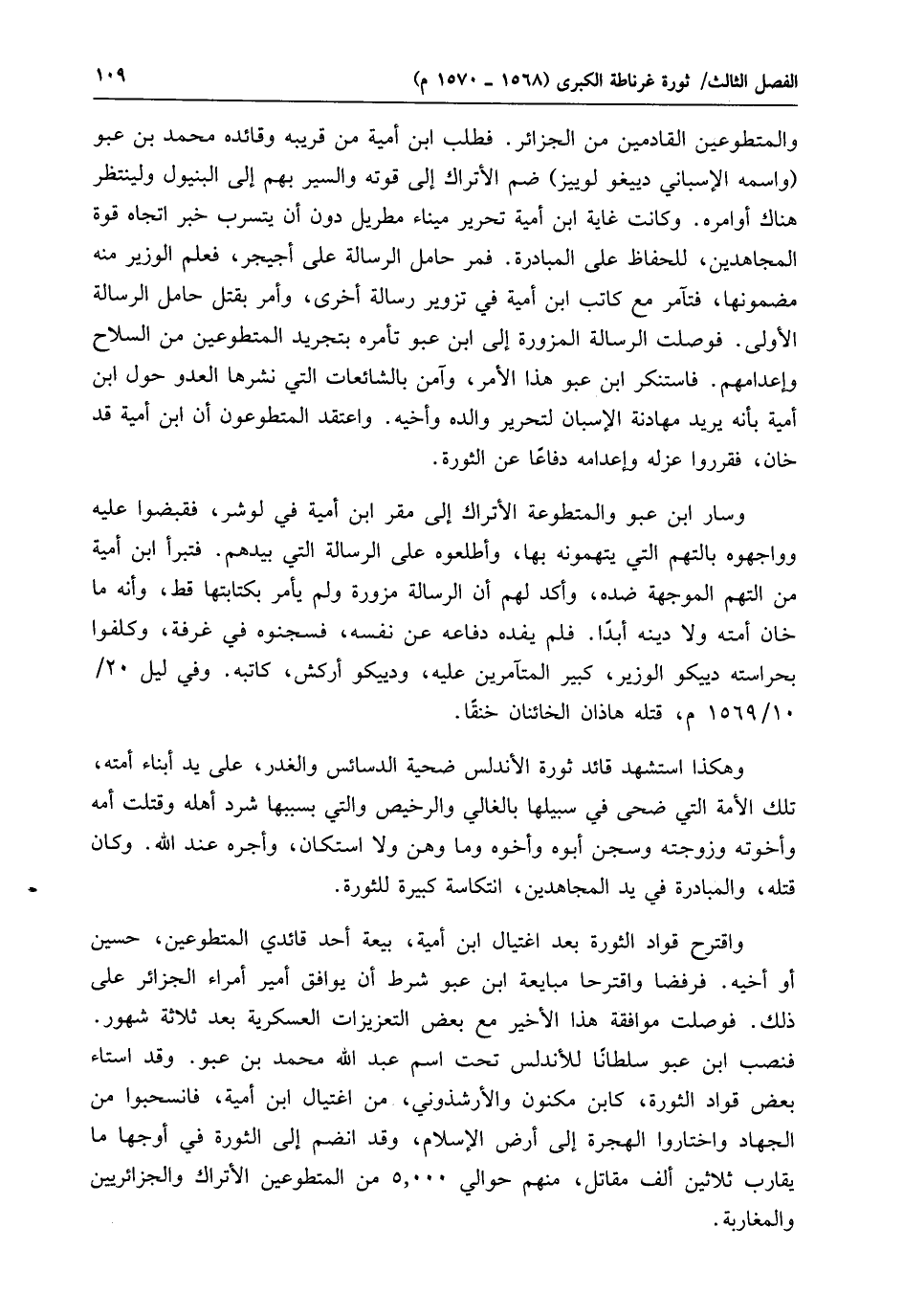 وسار ابن عبو والمتطوعة الأتراك إلى مقر ابن أمية في لوشر، فقبضوا عليه وواجهوه بالتهم التي يتهمونه بها، وأطلعوه على الرسالة التي بيدهم. فتبرأ ابن أمية من التهم الموجهة ضده، وأكد لهم أن الرسالة مزورة ولم يأمر بكتابتها قط، وأنه ما خان أمته ولا دينه أبدًا. فلم يفده دفاعه عن نفسه، فسجنوه في غرفة، وكلفوا بحراسته دييكو الوزير، كبير المتآمرين عليه، ودييكو أركش، كاتبه. وفي ليل 20/ 10 / 1569 م، قتله هاذان الخائنان خنقًا.