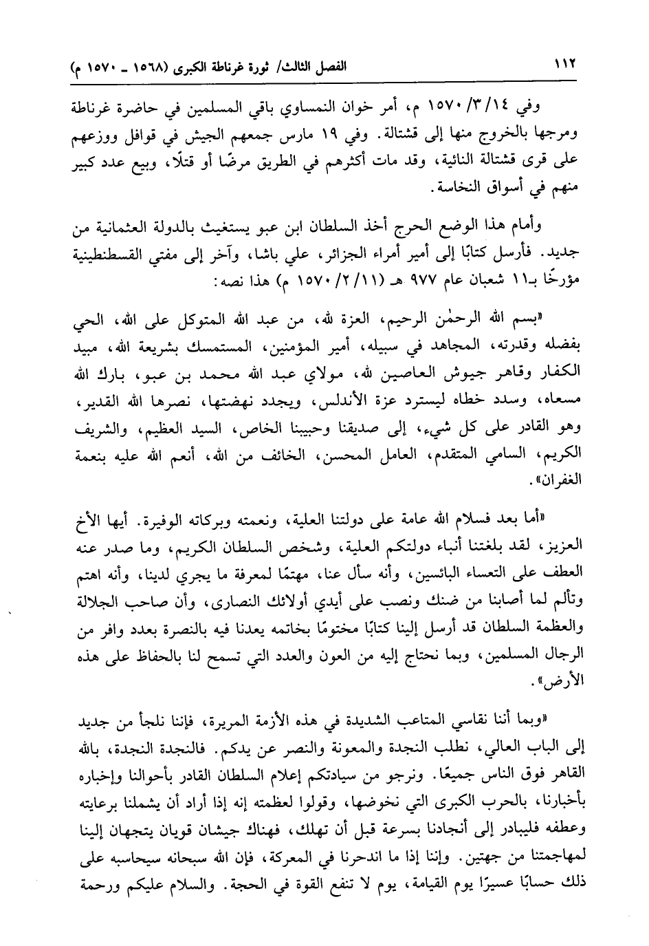 وأمام هذا الوضع الحرج أخذ السلطان ابن عبو يستغيث بالدولة العثمانية من جديد. فأرسل كتابًا إلى أمير أمراء الجزائر، علي باشا، وآخر إلى مفتي القسطنطينية مؤرخًا بـ 11 شعبان عام 977 هـ (11/ 2 / 1570 م) هذا نصه: "بسم الله الرحمن الرحيم، العزة لله، من عبد الله المتوكل على الله، الحي بفضله وقدرته، المجاهد في سبيله، أمير المؤمنين، المستمسك بشريعة الله، مبيد الكفار وقاهر جيوش العاصين لله، مولاي عبد الله محمد بن عبو، بارك الله مسعاه، وسدد خطاه ليسترد عزة الأندلس، ويجدد نهضتها، نصرها الله القدير، وهو القادر على كل شيء، إلى صديقنا وحبيبنا الخاص، السيد العظيم، والشريف الكريم، السامي المتقدم، العامل المحسن، الخائف من الله، أنعم الله عليه بنعمة الغفران".