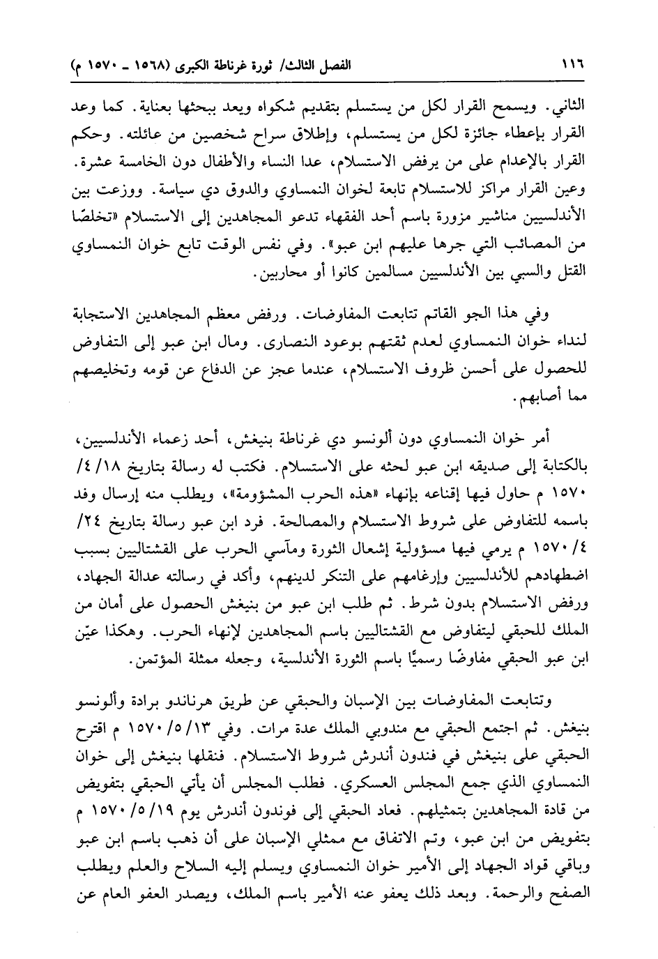 وتتابعت المفاوضات بين الإسبان والحبقي عن طريق هرناندو برادة وألونسو بنيغش. ثم اجتمع الحبقي مع مندوبي الملك عدة مرات. وفي 13/ 5 / 1570 م اقترح الحبقي على بنيغش في فندون أندرش شروط الاستسلام. فنقلها بنيغش إلى خوان النمساوي الذي جمع المجلس العسكري. فطلب المجلس أن يأتي الحبقي بتفويض من قادة المجاهدين بتمثيلهم. فعاد الحبقي إلى فوندون أندرش يوم 19/ 5 / 1570 م بتفويض من ابن عبو، وتم الاتفاق مع ممثلي الإسبان على أن ذهب باسم ابن عبو وباقي قواد الجهاد إلى الأمير خوان النمساوي ويسلم إليه السلاح والعلم ويطلب الصفح والرحمة. وبعد ذلك يعفو عنه الأمير باسم الملك، ويصدر العفو العام عن