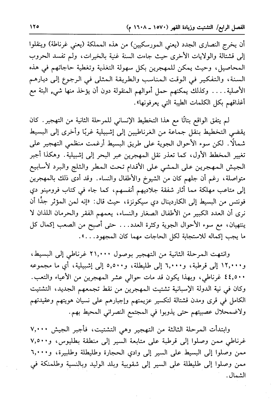 أن يخرج النصارى الجدد (يعني المورسكيين) من هذه المملكة (يعني غرناطة) وينقلوا إلى قشتالة والولايات الأخرى حيث جاءت السنة غنية بالخيرات، ولم تفسد الحروب المحاصيل، وحيث يمكن للمهجرين بكل سهولة التغذية وتغطية حاجاتهم في هذه السنة، والتفكير في الوقت المناسب والطريقة المثلى في الرجوع إلى ديارهم الأصلية .... وكذلك يمكنهم حمل أموالهم المنقولة دون أن يؤخذ منها شيء البتة مع إغداقهم بكل الكلمات الطيبة التي يعرفونها".