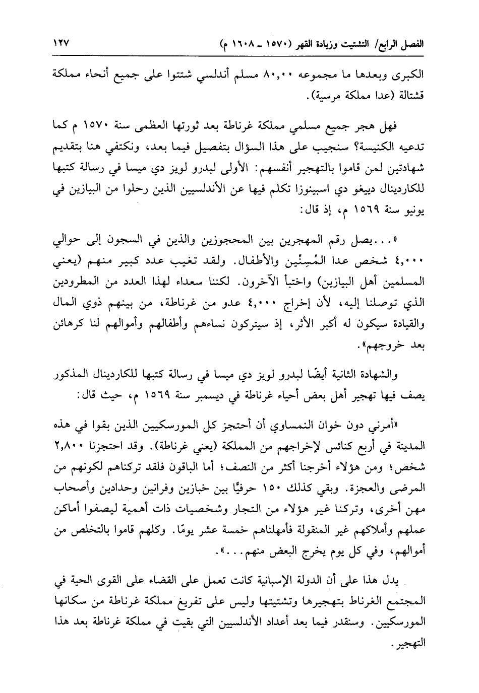 فهل هجر جميع مسلمي مملكة غرناطة بعد ثورتها العظمى سنة 1570 م كما تدعيه الكنيسة؟ سنجيب على هذا السؤال بتفصيل فيما بعد، ونكتفي هنا بتقديم شهادتين لمن قاموا بالتهجير أنفسهم: الأولى لبدرو لويز دي ميسا في رسالة كتبها للكاردينال دييغو دي اسبينوزا تكلم فيها عن الأندلسيين الذين رحلوا من البيازين في يونيو سنة 1569 م، إذ قال: " ... يصل رقم المهجرين بين المحجوزين والذين في السجون إلى حوالي 4.000 شخص عدا المُسِنِّين والأطفال. ولقد تغيب عدد كبير منهم (يعني المسلمين أهل البيازين) واختبأ الآخرون. لكننا سعداء لهذا العدد من المطرودين الذي توصلنا إليه، لأن إخراج 4.000 عدو من غرناطة، من بينهم ذوي المال والقيادة سيكون له أكبر الأثر، إذ سيتركون نساءهم وأطفالهم وأموالهم لنا كرهائن بعد خروجهم".