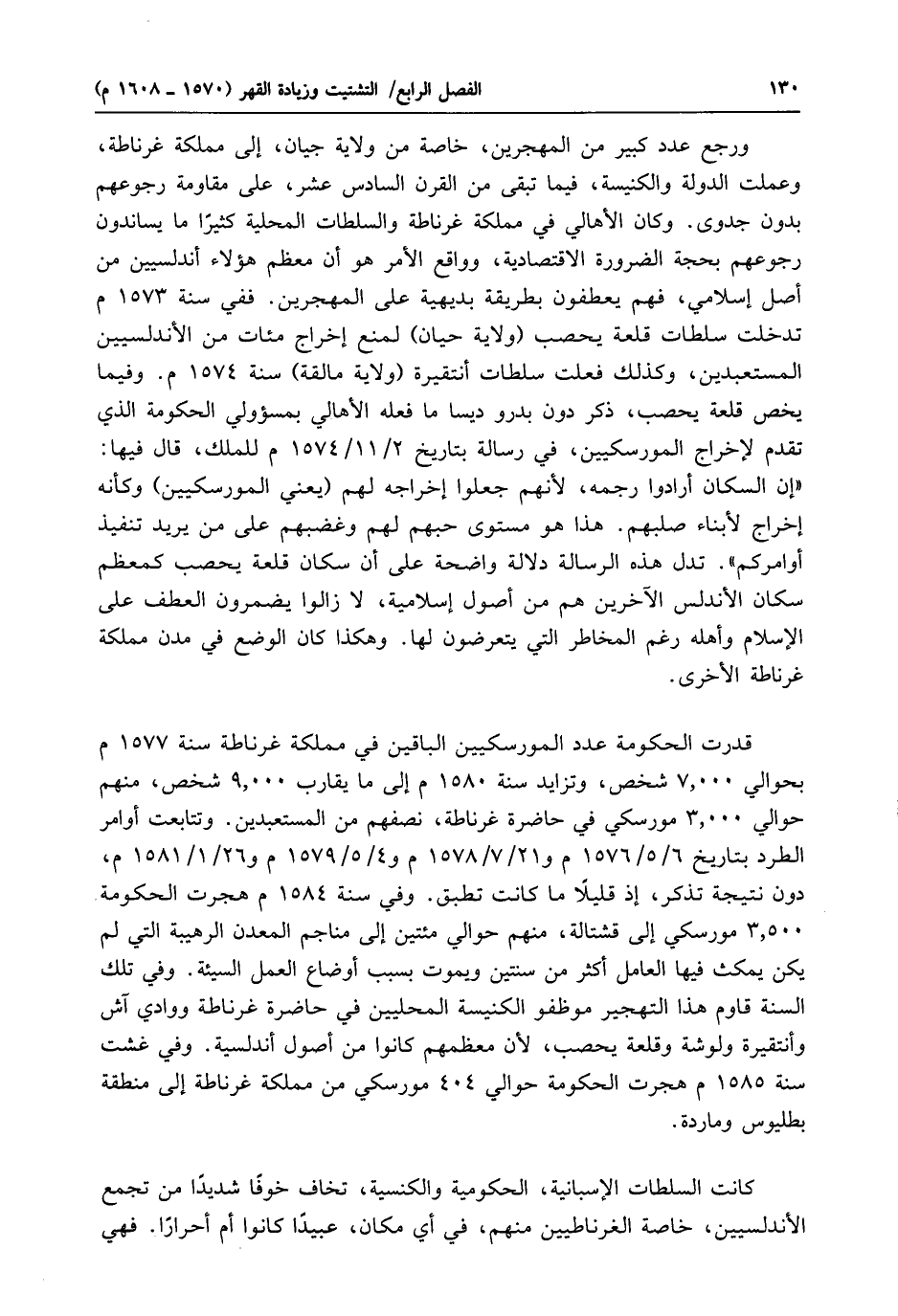 قدرت الحكومة عدد المورسكيين الباقين في مملكة غرناطة سنة 1577 م بحوالي 7.000 شخص، وتزايد سنة 1580 م إلى ما يقارب 9.000 شخص، منهم حوالي 3.000 مورسكي في حاضرة غرناطة، نصفهم من المستعبدين. وتتابعت أوامر الطرد بتاريخ 6/ 5 / 1576 م و 21/ 7 / 1578 م و 4/ 5 / 1579 م و 26/ 1 / 1581 م، دون نتيجة تذكر، إذ قليلاً ما كانت تطبق. وفي سنة 1584 م هجرت الحكومة 3.500 مورسكي إلى قشتالة، منهم حوالي مئتين إلى مناجم المعدن الرهيبة التي لم يكن يمكث فيها العامل أكثر من سنتين ويموت بسبب أوضاع العمل السيئة. وفي تلك السنة قاوم هذا التهجير موظفو الكنيسة المحليين في حاضرة غرناطة ووادي آش وأنتقيرة ولوشة وقلعة يحصب، لأن معظمهم كانوا من أصول أندلسية. وفي غشت سنة 1585 م هجرت الحكومة حوالي 404 مورسكي من مملكة غرناطة إلى منطقة بطليوس وماردة.