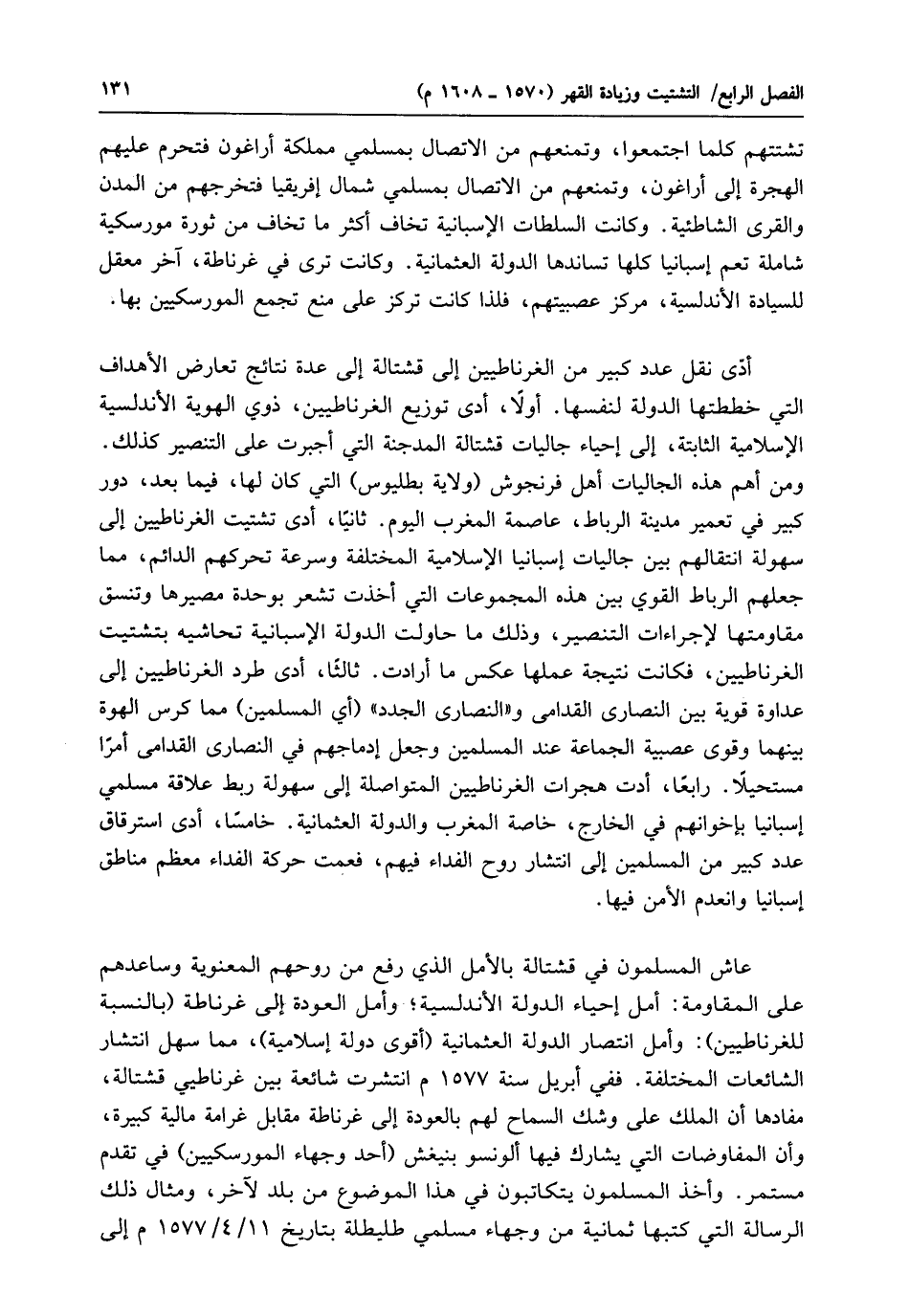تشتتهم كلما اجتمعوا، وتمنعهم من الاتصال بمسلمي مملكة أراغون فتحرم عليهم الهجرة إلى أراغون، وتمنعهم من الاتصال بمسلمي شمال إفريقيا فتخرجهم من المدن والقرى الشاطئية. وكانت السلطات الإسبانية تخاف أكثر ما تخاف من ثورة مورسكية شاملة تعم إسبانيا كلها تساندها الدولة العثمانية. وكانت ترى في غرناطة، آخر معقل للسيادة الأندلسية، مركز عصبيتهم، فلذا كانت تركز على منع تجمع المورسكيين بها.