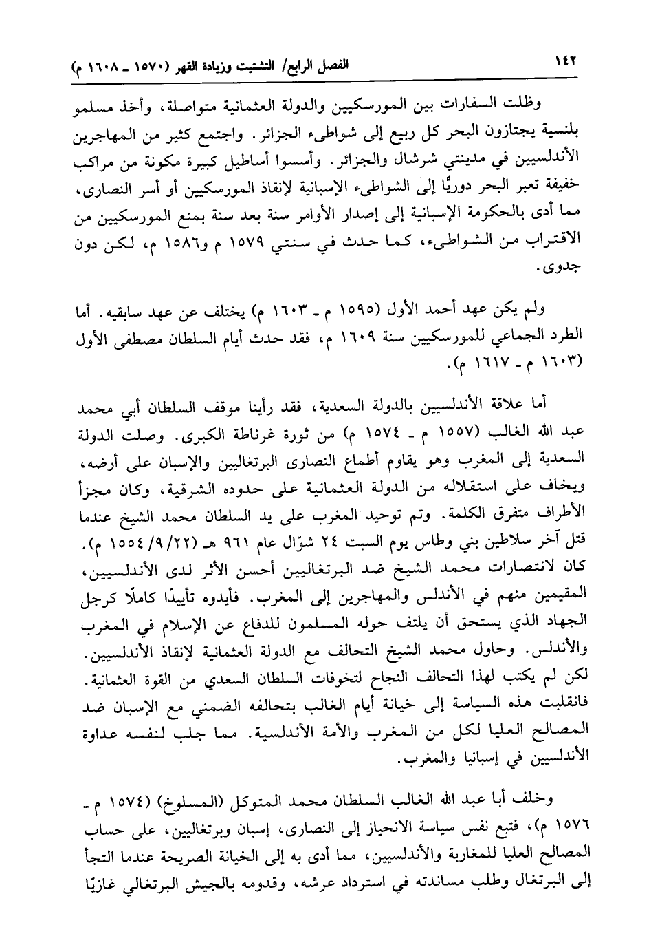 أما علاقة الأندلسيين بالدولة السعدية، فقد رأينا موقف السلطان أبي محمد عبد الله الغالب (1557 م - 1574 م) من ثورة غرناطة الكبرى. وصلت الدولة السعدية إلى المغرب وهو يقاوم أطماع النصارى البرتغاليين والإسبان على أرضه، ويخاف على استقلاله من الدولة العثمانية على حدوده الشرقية، وكان مجزأ الأطراف متفرق الكلمة. وتم توحيد المغرب على يد السلطان محمد الشيخ عندما قتل آخر سلاطين بني وطاس يوم السبت 24 شوّال عام 961 هـ (22/ 9 / 1554 م).