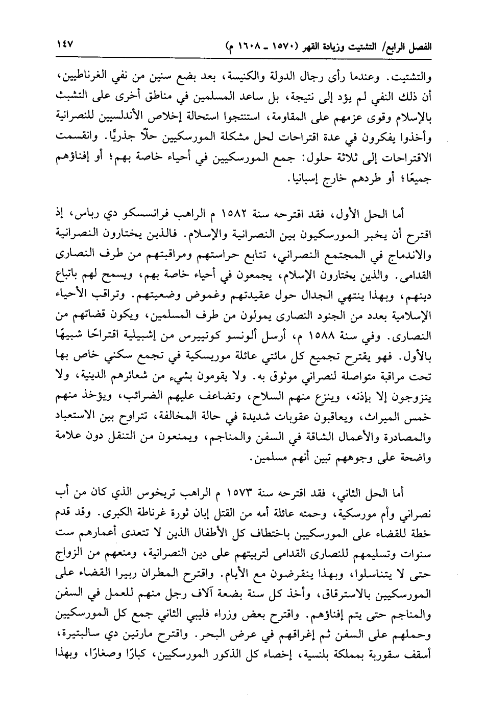 والتشتيت. وعندما رأى رجال الدولة والكنيسة، بعد بضع سنين من نفي الغرناطيين، أن ذلك النفي لم يؤد إلى نتيجة، بل ساعد المسلمين في مناطق أخرى على التشبث بالإسلام وقوى عزمهم على المقاومة، استنتجوا استحالة إخلاص الأندلسيين للنصرانية وأخذوا يفكرون في عدة اقتراحات لحل مشكلة المورسكيين حلاًّ جذريًّا. وانقسمت الاقتراحات إلى ثلاثة حلول: جمع المورسكيين في أحياء خاصة بهم؛ أو إفناؤهم جميعًا؛ أو طردهم خارج إسبانيا.