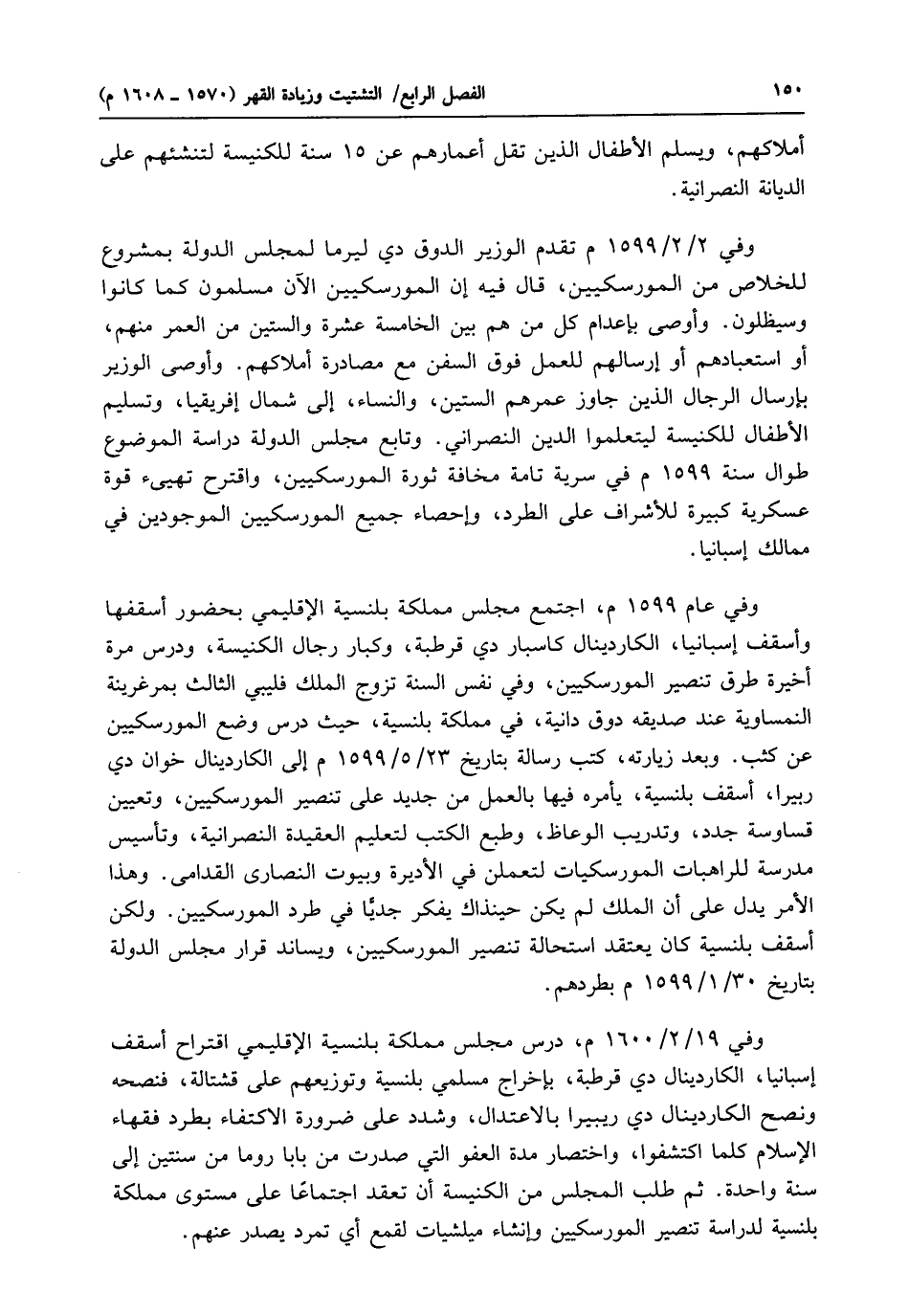 وفي 19/ 2 / 1600 م، درس مجلس مملكة بلنسية الإقليمي اقتراح أسقف إسبانيا، الكاردينال دي قرطبة، بإخراج مسلمي بلنسية وتوزيعهم على قشتالة، فنصحه ونصح الكاردينال دي ريبيرا بالاعتدال، وشدد على ضرورة الاكتفاء بطرد فقهاء الإسلام كلما اكتشفوا، واختصار مدة العفو التي صدرت من بابا روما من سنتين إلى سنة واحدة. ثم طلب المجلس من الكنيسة أن تعقد اجتماعًا على مستوى مملكة بلنسية لدراسة تنصير المورسكيين وإنشاء ميلشيات لقمع أي تمرد يصدر عنهم.