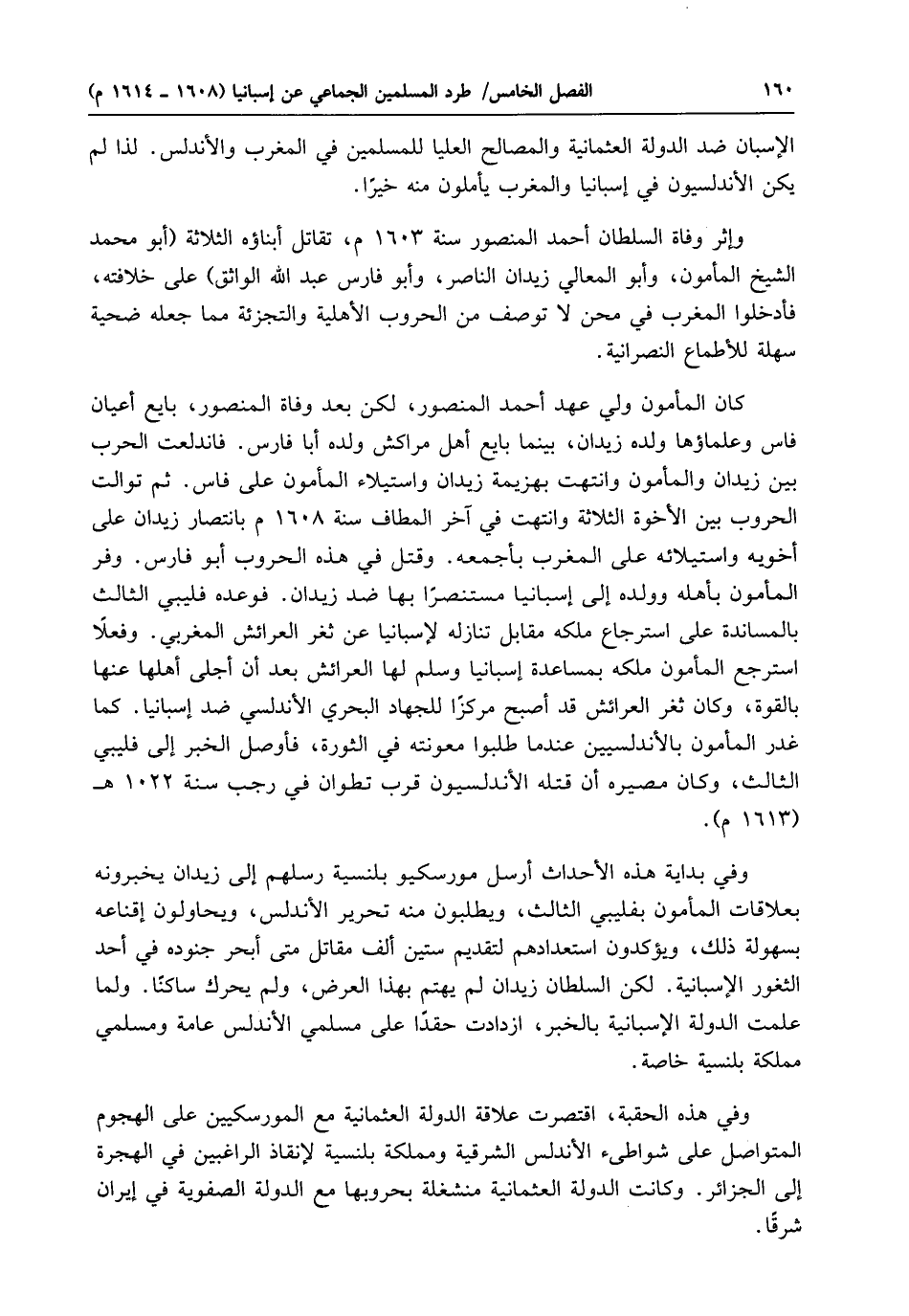 وإثر وفاة السلطان أحمد المنصور سنة 1603 م، تقاتل أبناؤه الثلاثة (أبو محمد الشيخ المأمون، وأبو المعالي زيدان الناصر، وأبو فارس عبد الله الواثق) على خلافته، فأدخلوا المغرب في محن لا توصف من الحروب الأهلية والتجزئة مما جعله ضحية سهلة للأطماع النصرانية.