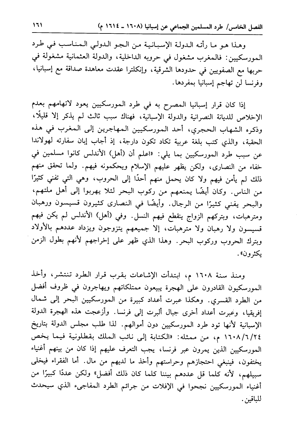 إذا كان قرار إسبانيا المصرح به في طرد المورسكيين يعود لاتهامهم بعدم الإخلاص للديانة النصرانية والدولة الإسبانية، فهناك سبب ثالث لم يذكر إلا قليلاً، وذكره الشهاب الحجري، أحد المورسكيين المهاجرين إلى المغرب في هذه الحقبة، والذي كتب بلغة عربية تكاد تكون دارجة، إذ أجاب إبان سفارته لهولاندا عن سبب طرد المورسكيين بما يلي: "اعلم أن (أهل) الأندلس كانوا مسلمين في خفاء من النصارى، ولكن يظهر عليهم الإسلام ويحكمونه فيهم. ولما تحقق منهم ذلك لم يأمن فيهم ولا كان يحمل منهم أحدًا إلى الحروب، وهي التي تفني كثيرًا من الناس. وكان أيضًا يمنعهم من ركوب البحر لئلا يهربوا إلى أهل ملتهم، والبحر يفني كثيرًا من الرجال. وأيضًا في النصارى كثيرون قسيسون ورهبان ومترهبات، وبتركهم الزواج ينقطع فيهم النسل. وفي (أهل) الأندلس لم يكن فيهم قسيسون ولا رهبان ولا مترهبات، إلا جميعهم يتزوجون ويزداد عددهم بالأولاد وبترك الحروب وركوب البحر. وهذا الذي ظهر على إخراجهم لأنهم بطول الزمن يكثرون".