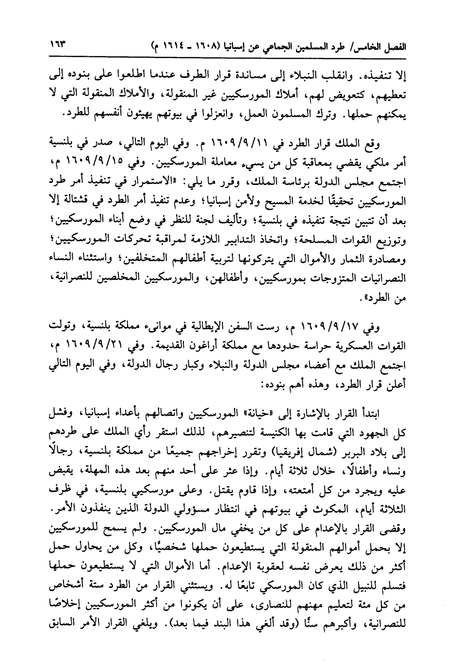 وفي 17/ 9 / 1609 م، رست السفن الإيطالية في موانىء مملكة بلنسية، وتولت القوات العسكرية حراسة حدودها مع مملكة أراغون القديمة. وفي 21/ 9 / 1609 م، اجتمع الملك مع أعضاء مجلس الدولة والنبلاء وكبار رجال الدولة، وفي اليوم التالي أعلن قرار الطرد، وهذه أهم بنوده: ابتدأ القرار بالإشارة إلى "خيانة" المورسكيين واتصالهم بأعداء إسبانيا، وفشل كل الجهود التي قامت بها الكنيسة لتنصيرهم، لذلك استقر رأي الملك على طردهم إلى بلاد البربر (شمال إفريقيا) وتقرر إخراجهم جميعًا من مملكة بلنسية، رجالاً ونساء وأطفالاً، خلال ثلاثة أيام. وإذا عثر على أحد منهم بعد هذه المهلة، يقبض عليه ويجرد من كل أمتعته، وإذا قاوم يقتل. وعلى مورسكيي بلنسية، في ظرف الثلاثة أيام، المكوث في بيوتهم في انتظار مسؤولي الدولة الذين ينفذون الأمر.