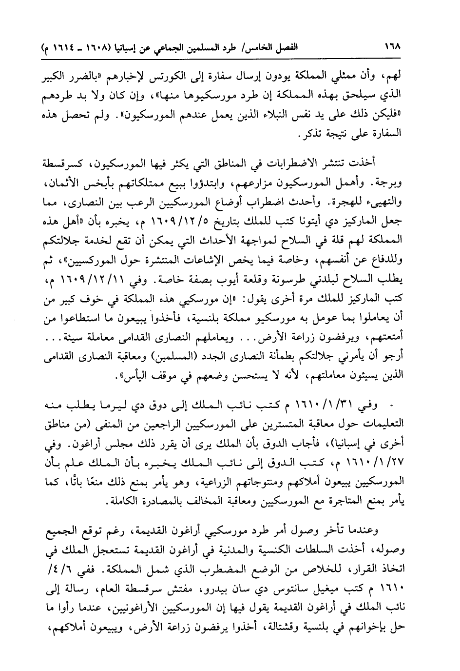 لهم، وأن ممثلي المملكة يودون إرسال سفارة إلى الكورتس لإخبارهم "بالضرر الكبير الذي سيلحق بهذه المملكة إن طرد مورسكيوها منها"، وإن كان ولا بد طردهم "فليكن ذلك على يد نفس النبلاء الذين يعمل عندهم المورسكيون". ولم تحصل هذه السفارة على نتيجة تذكر.