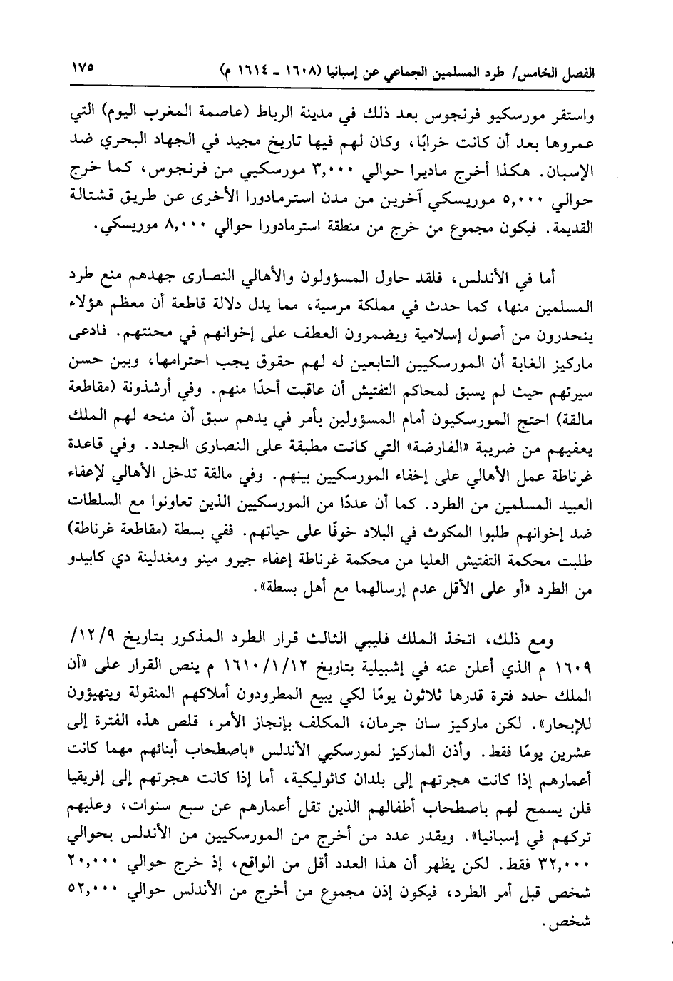 ومع ذلك، اتخذ الملك فليبي الثالث قرار الطرد المذكور بتاريخ 9/ 12 / 1609 م الذي أعلن عنه في إشبيلية بتاريخ 12/ 1 / 1610 م ينص القرار على "أن الملك حدد فترة قدرها ثلاثون يومًا لكي يبيع المطرودون أملاكهم المنقولة ويتهيؤون للإبحار". لكن ماركيز سان جرمان، المكلف بإنجاز الأمر، قلص هذه الفترة إلى عشرين يومًا فقط. وأذن الماركيز لمورسكيي الأندلس "باصطحاب أبنائهم مهما كانت أعمارهم إذا كانت هجرتهم إلى بلدان كاثوليكية، أما إذا كانت هجرتهم إلى إفريقيا فلن يسمح لهم باصطحاب أطفالهم الذين تقل أعمارهم عن سبع سنوات، وعليهم تركهم في إسبانيا". ويقدر عدد من أخرج من المورسكيين من الأندلس بحوالي 32.000 فقط. لكن يظهر أن هذا العدد أقل من الواقع، إذ خرج حوالي 20.000 شخص قبل أمر الطرد، فيكون إذن مجموع من أخرج من الأندلس حوالي 52.000 شخص.