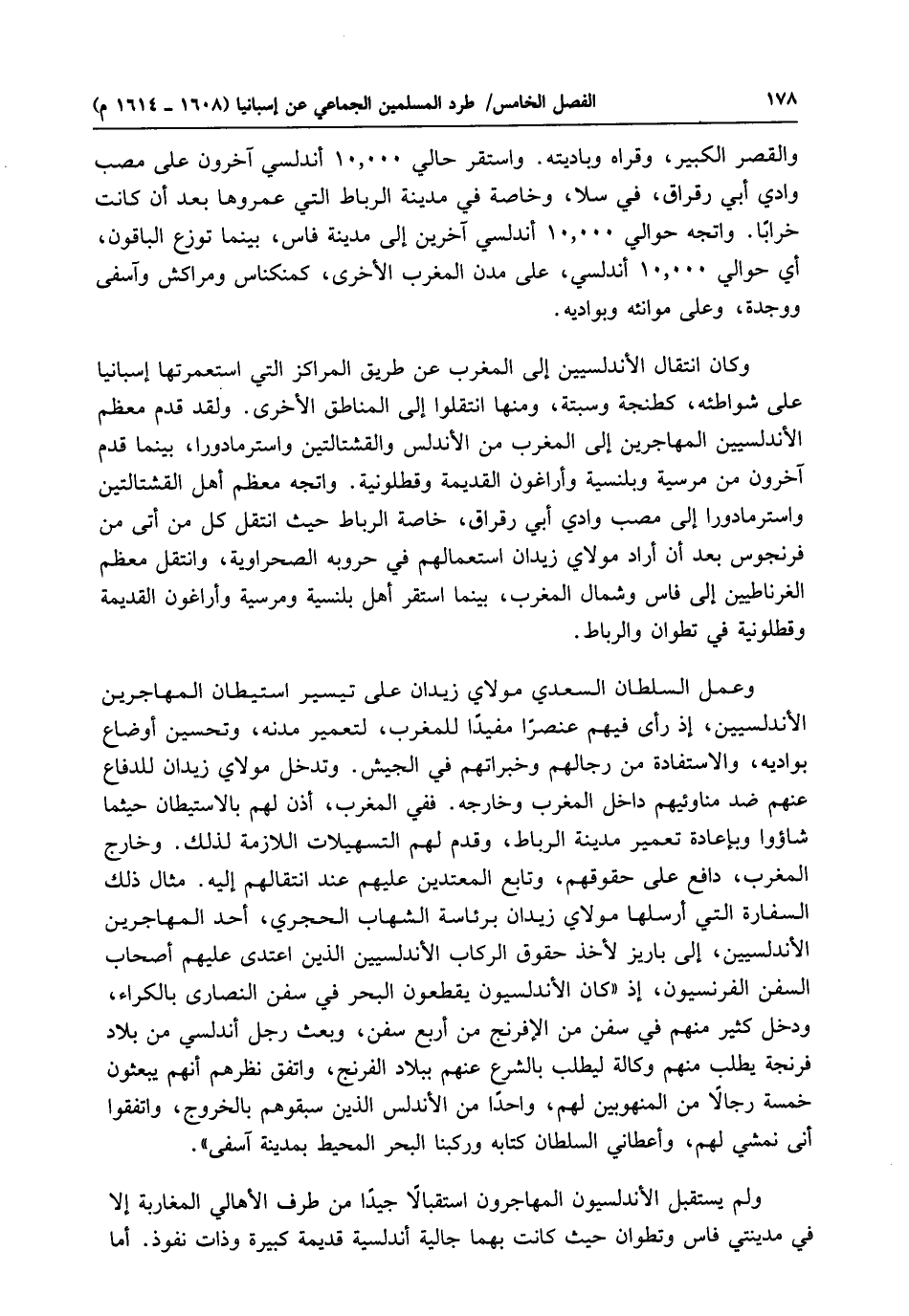 والقصر الكبير، وقراه وباديته. واستقر حوالي 10.000 أندلسي آخرون على مصب وادي أبي رقراق، في سلا، وخاصة في مدينة الرباط التي عمروها بعد أن كانت خرابًا. واتجه حوالي 10.000 أندلسي آخرين إلى مدينة فاس، بينما توزع الباقون، أي حوالي 10.000 أندلسي، على مدن المغرب الأخرى، كمكناس ومراكش وآسفى ووجدة، وعلى موانئه وبواديه.