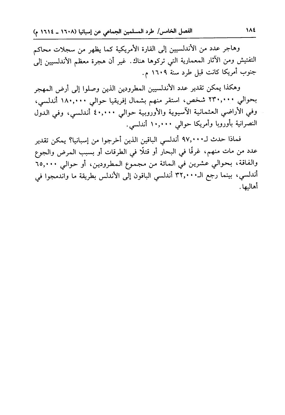 وهكذا يمكن تقدير عدد الأندلسيين المطرودين الذين وصلوا إلى أرض المهجر بحوالي 230.000 شخص، استقر منهم بشمال إفريقيا حوالي 180.000 أندلسي، وفي الأراضي العثمانية الآسيوية والأوروبية حوالي 40.000 أندلسي، وفي الدول النصرانية بأوروبا وأمريكا حوالي 10.000 أندلسي.