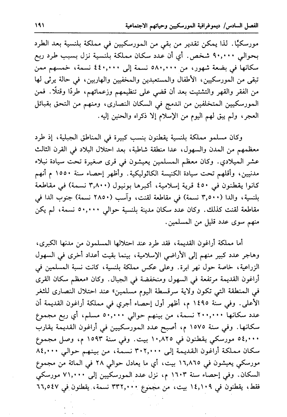 مورسكيًّا. لذا يمكن تقدير من بقي من المورسكيين في مملكة بلنسية بعد الطرد بحوالي 90.000 شخص. أي أن عدد سكان مملكة بلنسية نزل بسبب طرد ربع سكانها في بضعة شهور، من 580.000 نسمة إلى 440.000 نسمة، خمسهم ممن تبقى من المورسكيين، الأطفال والمستعبدين والمخفيين والهاربين، في حالة يرثى لها من الفقر والقهر والتشتيت بعد أن قضي على تنظيمهم وزعمائهم، طردًا وقتلاً. فمن المورسكيين المتخلفين من اندمج في السكان النصارى، ومنهم من التحق بقبائل الغجر، ولم يبق لهم اليوم من الإسلام إلا ذكراه والحنين إليه.