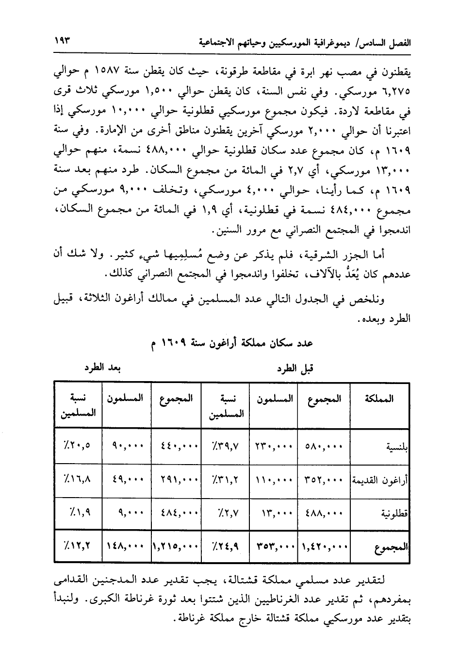 يقطنون في مصب نهر ابرة في مقاطعة طرقونة، حيث كان يقطن سنة 1587 م حوالي 6.275 مورسكي. وفي نفس السنة، كان يقطن حوالي 1.500 مورسكي ثلاث قرى في مقاطعة لاردة. فيكون مجموع مورسكيي قطلونية حوالي 10.000 مورسكي إذا اعتبرنا أن حوالي 2.000 مورسكي آخرين يقطنون مناطق أخرى من الإمارة. وفي سنة 1609 م، كان مجموع عدد سكان قطلونية حوالي 488.000 نسمة، منهم حوالي 13.000 مورسكي، أي 2.7 في المائة من مجموع السكان. طرد منهم بعد سنة 1609 م، كما رأينا، حوالي 4.000 مورسكي، وتخلف 9.000 مورسكي من مجموع 484.000 نسمة في قطلونية، أي 1.9 في المائة من مجموع السكان، اندمجوا في المجتمع النصراني مع مرور السنين.
