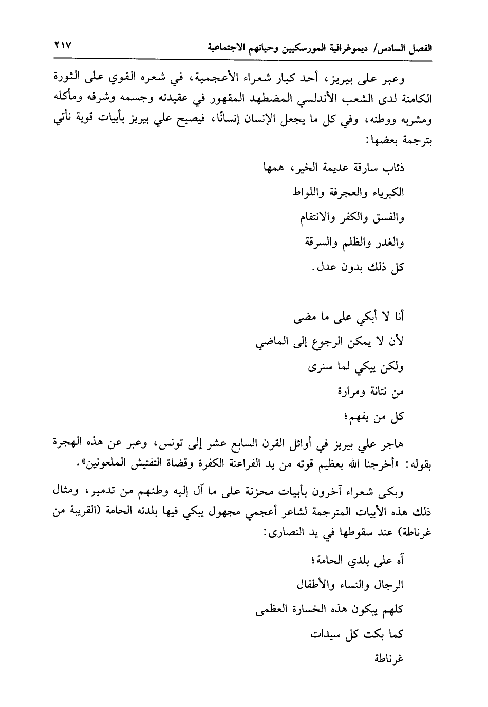 هاجر علي بيريز في أوائل القرن السابع عشر إلى تونس، وعبّر عن هذه الهجرة بقوله: "أخرجنا الله بعظيم قوته من يد الفراعنة الكفرة وقضاة التفتيش الملعونين". وبكى شعراء آخرون بأبيات محزنة على ما آل إليه وطنهم من تدمير، ومثال ذلك هذه الأبيات المترجمة لشاعر أعجمي مجهول يبكي فيها بلدته الحامة (القريبة من غرناطة) عند سقوطها في يد النصارى: