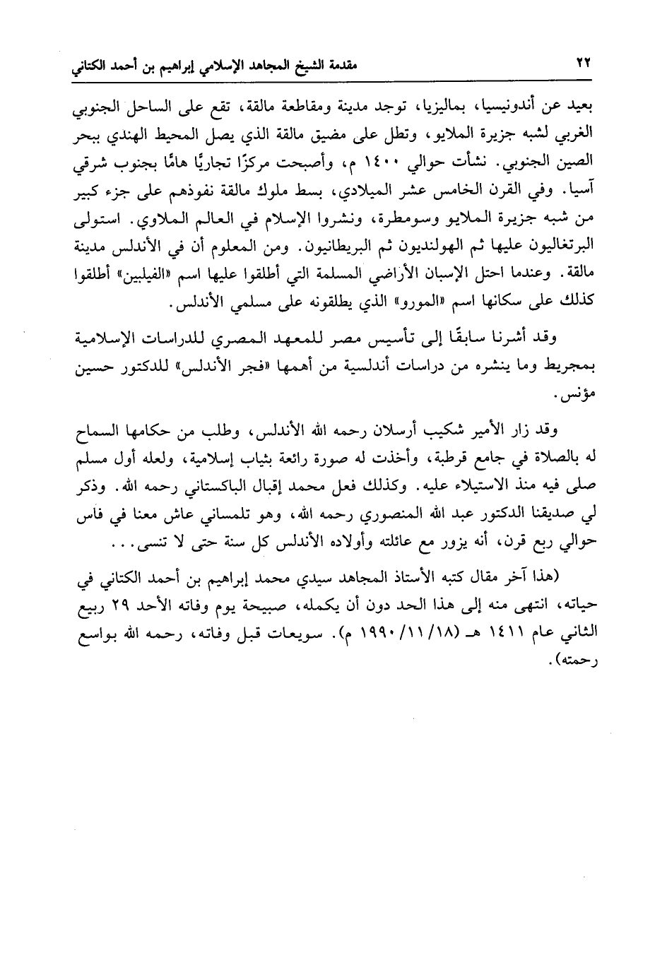 له بالصلاة في جامع قرطبة، وأخذت له صورة رائعة بثياب إسلامية، ولعله أول مسلم صلى فيه منذ الاستيلاء عليه. وكذلك فعل محمد إقبال الباكستاني - رحمه الله -. وذكر لي صديقنا الدكتور عبد الله المنصوري - رحمه الله -، وهو تلمساني عاش معنا في فاس حوالي ربع قرن، أنه يزور مع عائلته وأولاده الأندلس كل سنة حتى لا تنسى ... (هذا آخر مقال كتبه الأستاذ المجاهد سيدي محمد إبراهيم بن أحمد الكتاني في حياته، انتهى منه إلى هذا الحد دون أن يكمله، صبيحة يوم وفاته الأحد 29 ربيع الثاني عام 1411 هـ (18/ 11/ 1990 م). سويعات قبل وفاته، - رحمه الله - بواسع رحمته).