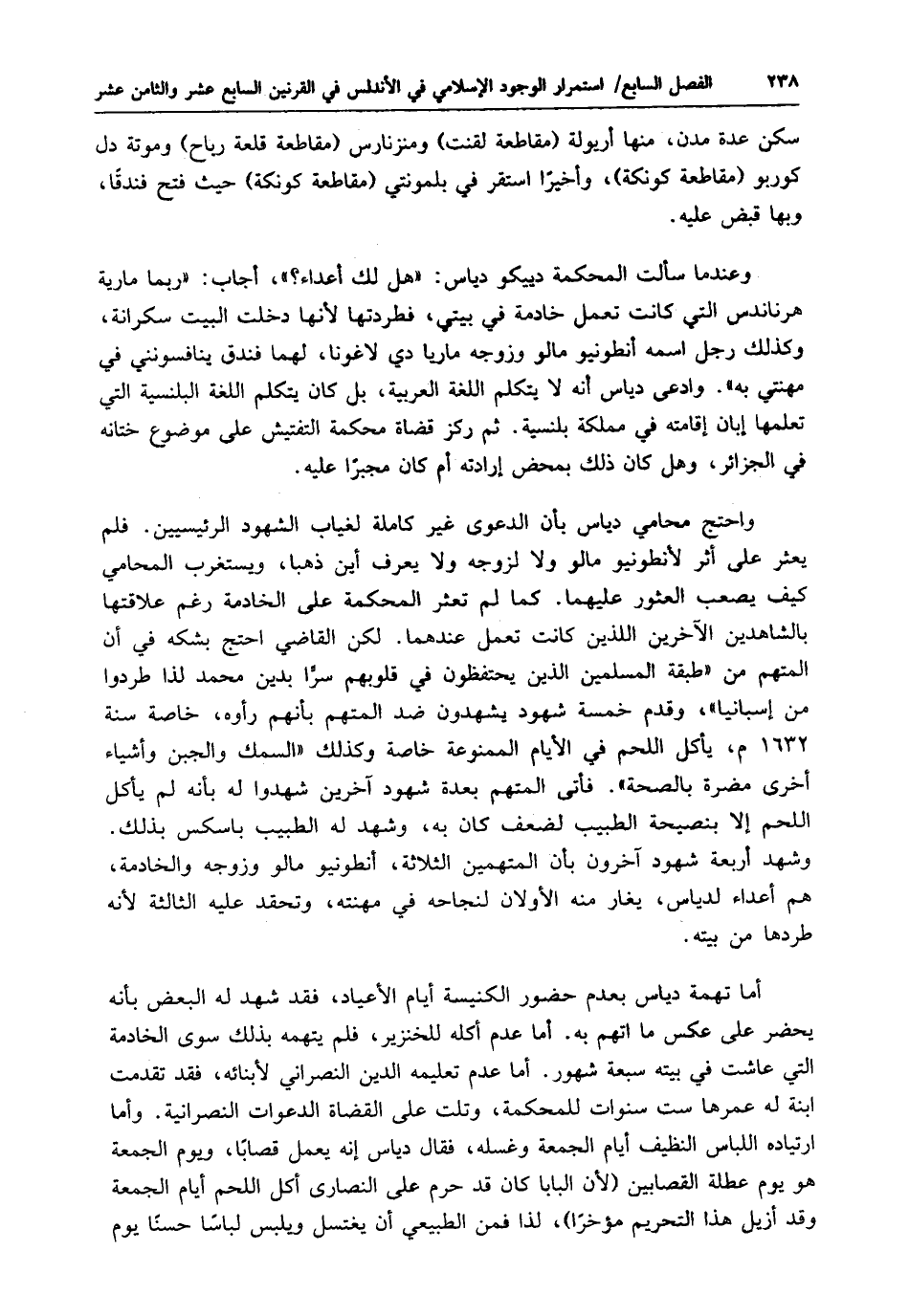 واحتج محامي دياس بأن الدعوى غير كاملة لغياب الشهود الرئيسيين. فلم يعثر على أثر لأنطونيو مالو ولا لزوجه ولا يعرف أين ذهبا، ويستغرب المحامي كيف يصعب العثور عليهما. كما لم تعثر المحكمة على الخادمة رغم علاقتها بالشاهدين الآخرين اللذين كانت تعمل عندهما. لكن القاضي احتج بشكه في أن المتهم من "طبقة المسلمين الذين يحتفظون في قلوبهم سرًّا بدين محمد لذا طردوا من إسبانيا"، وقدم خمسة شهود يشهدون ضد المتهم بأنهم رأوه، خاصة سنة 1632 م، يأكل اللحم في الأيام الممنوعة خاصة وكذلك "السمك والجبن وأشياء أخرى مضرة بالصحة". فأتى المتهم بعدة شهود آخرين شهدوا له بأنه لم يأكل