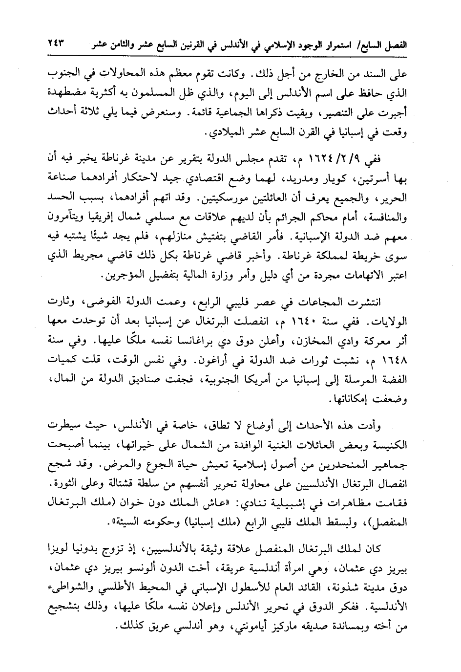 على السند من الخارج من أجل ذلك. وكانت تقوم معظم هذه المحاولات في الجنوب الذي حافظ على اسم الأندلس إلى اليوم، والذي ظل المسلمون به أكثرية مضطهدة أجبرت على التنصير، وبقيت ذكراها الجماعية قائمة. وسنعرض فيما يلي ثلاثة أحداث وقعت في إسبانيا في القرن السابع عشر الميلادي.
