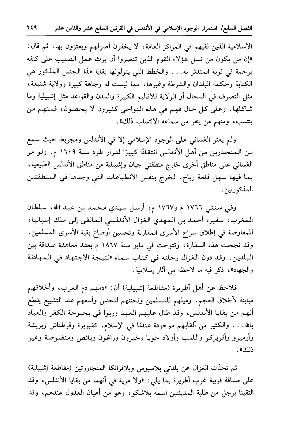الإسلامية الذين لقيهم في المراكز العامة، لا يخفون أصولهم ويعتزون بها. ثم قال: "إن من يكون من نسل هؤلاء القوم الذين تنصروا أن يرث عمل الصليب على كتفه برحمة في ثوبه المتدثر به ... والخطط التي يتولونها بقايا هذا الجنس المذكور هي الكتابة وحكمة البلدان والشرطة وغيرها، مما ليست له وجاهة كبيرة وولاية شنيعة، مثل التصرف في المحال أو الولاية للأقاليم الكبيرة والمدن والقواعد مثل إشبيلية وما شاكلها. وعلى كل حال فهم في هذه النواحي كثيرون لا يحصون، فمنهم من ينتسب، ومنهم من ينفر من سماعه الانتساب ذلك".