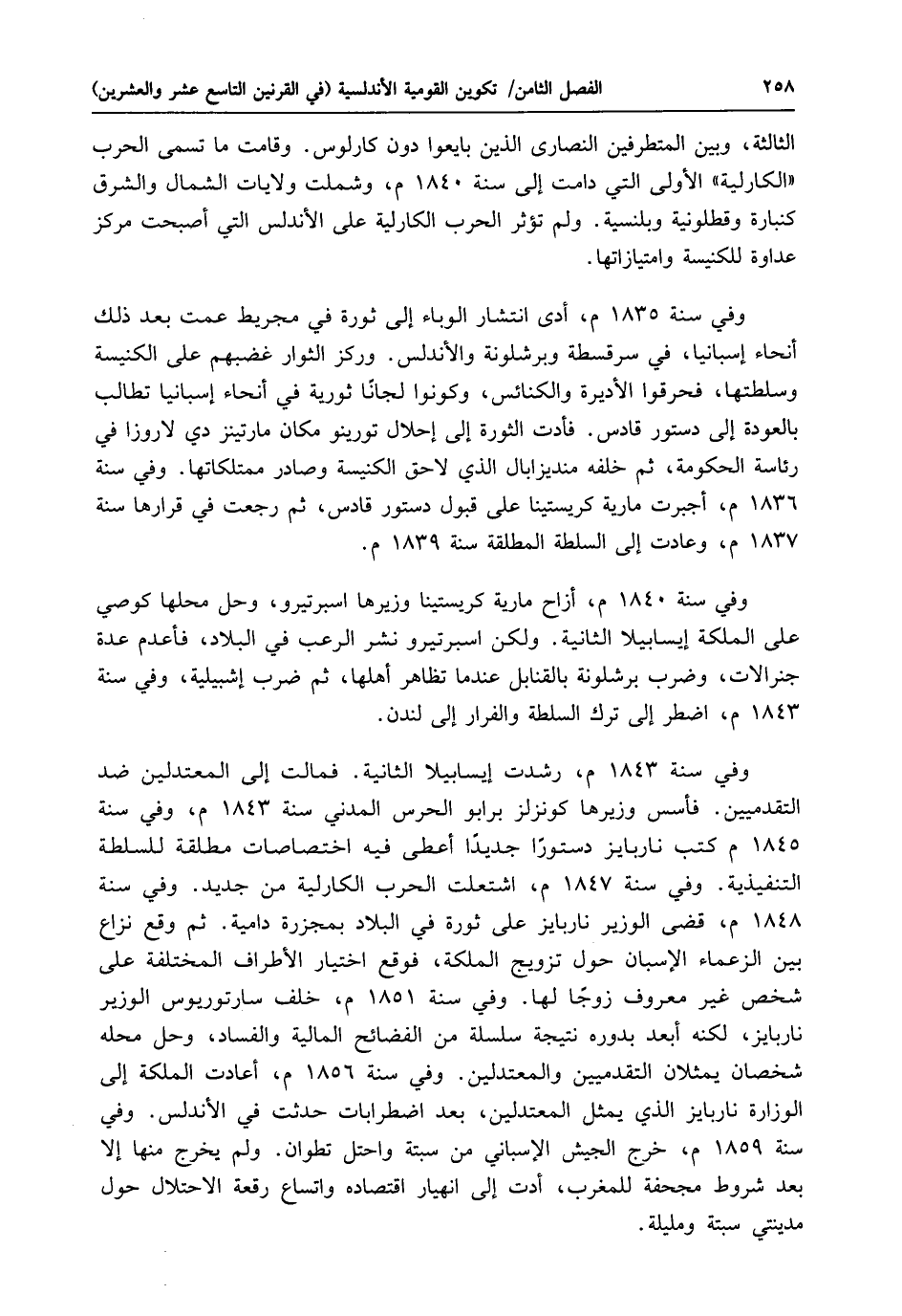 الثالثة، وبين المتطرفين النصارى الذين بايعوا دون كارلوس. وقامت ما تسمى الحرب "الكارلية" الأولى التي دامت إلى سنة 1840 م، وشملت ولايات الشمال والشرق كنبارة وقطلونية وبلنسية. ولم تؤثر الحرب الكارلية على الأندلس التي أصبحت مركز عداوة للكنيسة وامتيازاتها.