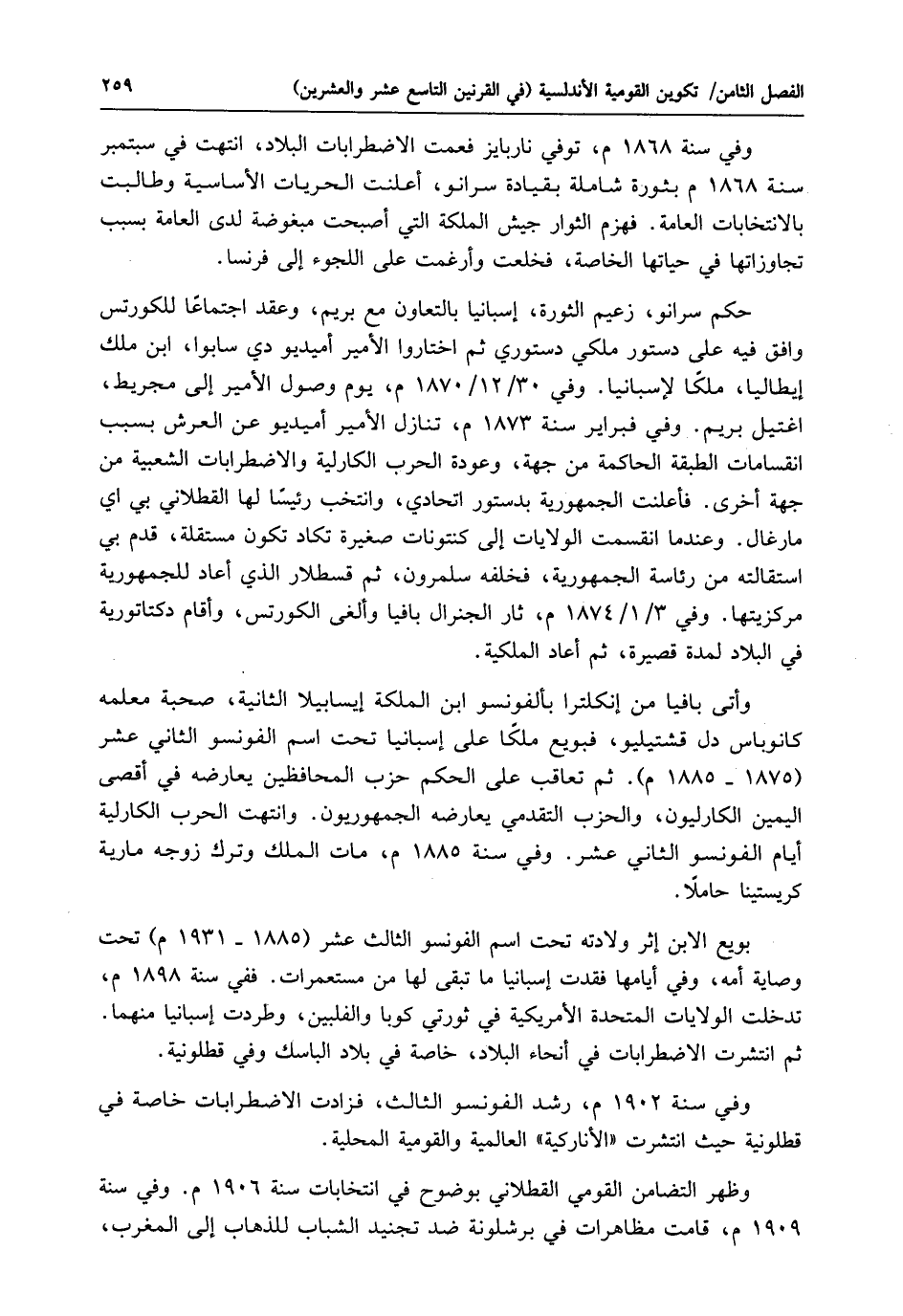مارغال. وعندما انقسمت الولايات إلى كنتونات صغيرة تكاد تكون مستقلة، قدم بي استقالته من رئاسة الجمهورية، فخلفه سلمرون، ثم قسطلار الذي أعاد للجمهورية مركزيتها. وفي 3/ 1 / 1874 م، ثار الجنرال بافيا وألغى الكورتس، وأقام دكتاتورية في البلاد لمدة قصيرة، ثم أعاد الملكية.