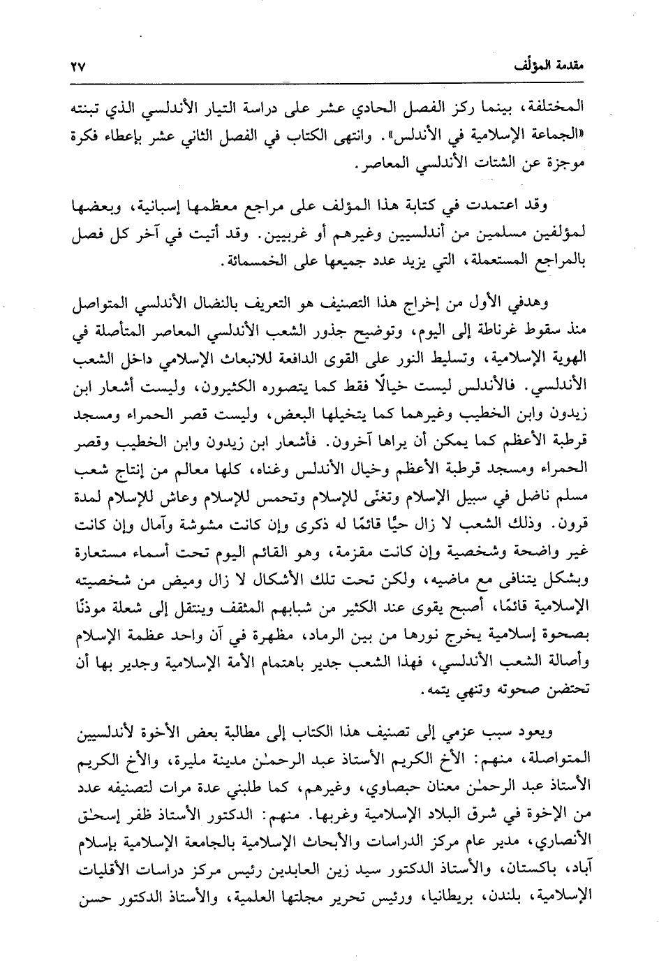 وهدفي الأول من إخراج هذا التصنيف هو التعريف بالنضال الأندلسي المتواصل منذ سقوط غرناطة إلى اليوم، وتوضيح جذور الشعب الأندلسي المعاصر المتأصلة في الهوية الإسلامية، وتسليط النور على القوى الدافعة للانبعاث الإسلامي داخل الشعب الأندلسي. فالأندلس ليست خيالاً فقط كما يتصوره الكثيرون، وليست أشعار ابن زيدون وابن الخطيب وغيرهما كما يتخيلها البعض، وليست قصر الحمراء ومسجد قرطبة الأعظم كما يمكن أن يراها آخرون. فأشعار ابن زيدون وابن الخطيب وقصر الحمراء ومسجد قرطبة الأعظم وخيال الأندلس وغناه، كلها معالم من إنتاج شعب مسلم ناضل في سبيل الإسلام وتغنّى للإسلام وتحمس للإسلام وعاش للإسلام لمدة قرون. وذلك الشعب لا زال حيًّا قائمًا له ذكرى وإن كانت مشوشة وآمال وإن كانت غير واضحة وشخصية وإن كانت مقزمة، وهو القائم اليوم تحت أسماء مستعارة وبشكل يتنافى مع ماضيه، ولكن تحت تلك الأشكال لا زال وميض من شخصيته الإسلامية قائمًا، أصبح يقوى عند الكثير من شبابهم المثقف وينتقل إلى شعلة موذنًا بصحوة إسلامية يخرج نورها من بين الرماد، مظهرة في آن واحد عظمة الإسلام وأصالة الشعب الأندلسي، فهذا الشعب جدير باهتمام الأمة الإسلامية وجدير بها أن تحتضن صحوته وتنهي يتمه.