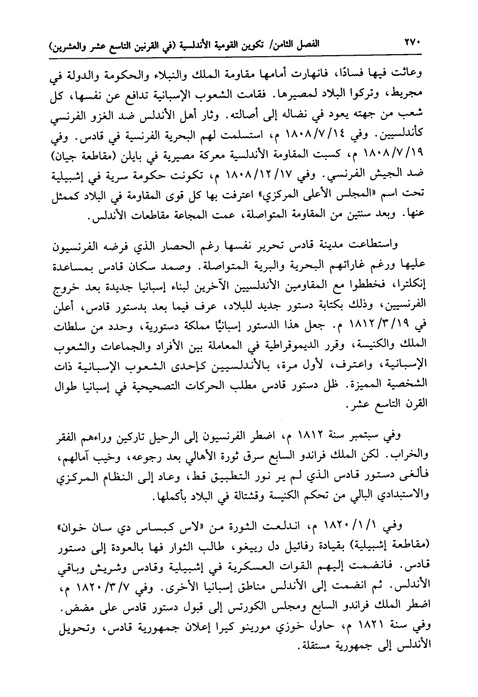 واستطاعت مدينة قادس تحرير نفسها رغم الحصار الذي فرضه الفرنسيون عليها ورغم غاراتهم البحرية والبرية المتواصلة. وصمد سكان قادس بمساعدة إنكلترا، فخططوا مع المقاومين الأندلسيين الآخرين لبناء إسبانيا جديدة بعد خروج الفرنسيين، وذلك بكتابة دستور جديد للبلاد، عرف فيما بعد بدستور قادس، أعلن في 19/ 3 / 1812 م. جعل هذا الدستور إسبانيا مملكة دستورية، وحدّ من سلطات الملك والكنيسة، وقرر الديموقراطية في المعاملة بين الأفراد والجماعات والشعوب الإسبانية، واعترف، لأول مرة، بالأندلسيين كإحدى الشعوب الإسبانية ذات الشخصية المميزة. ظل دستور قادس مطلب الحركات التصحيحية في إسبانيا طوال القرن التاسع عشر.