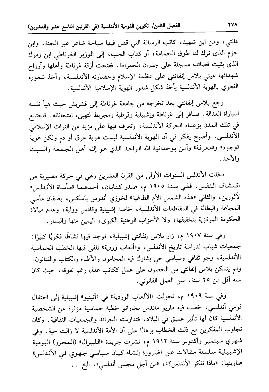دانتي، ومن ابن شهيد، كاتب الرسالة التي قص فيها سياحة شاعر عبر الجنة، وابن حزم الذي ترك لنا طوق الحمامة، أو كتاب الحب، إلى الوزير الغرناطي ابن زمرك الذي بقيت قصائده مسجلة على جدران الحمراء". ففتحت أزقة غرناطة وأهلها وأرواح شهدائها عيني بلاس إنفانتي على عظمة الإسلام وحضارته الأندلسية، وأخذ شعوره الفطري بالهوية الأندلسية يأخذ شكل شعور الهوية الإسلامية الأندلسية.
