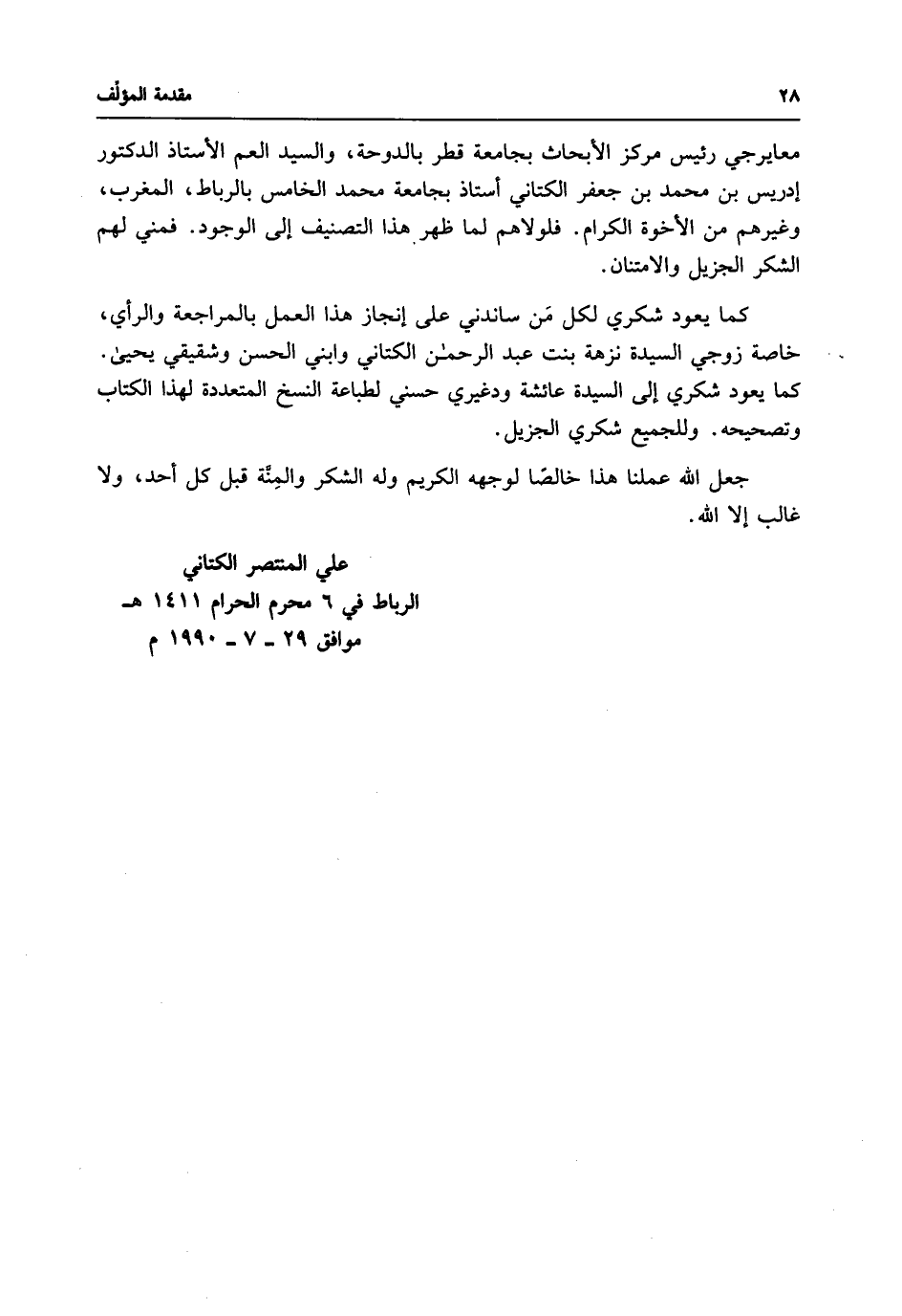 كما يعود شكري لكل مَن ساندني على إنجاز هذا العمل بالمراجعة والرأي، خاصة زوجي السيدة نزهة بنت عبد الرحمن الكتاني وابني الحسن وشقيقي يحيى. كما يعود شكري إلى السيدة عائشة ودغيري حسني لطباعة النسخ المتعددة لهذا الكتاب وتصحيحه. وللجميع شكري الجزيل.