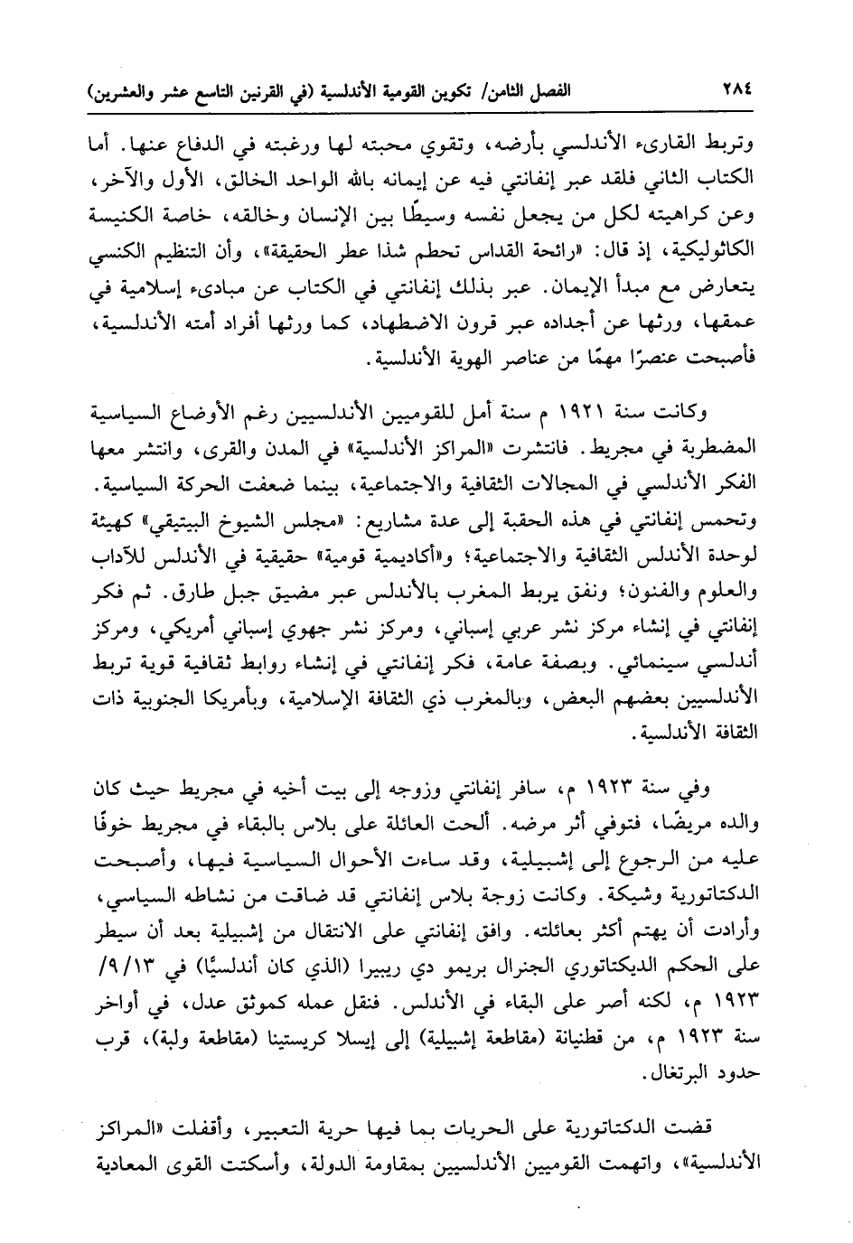 وتربط القارىء الأندلسي بأرضه، وتقوي محبته لها ورغبته في الدفاع عنها. أما الكتاب الثاني فلقد عبر إنفانتي فيه عن إيمانه بالله الواحد الخالق، الأول والآخر، وعن كراهيته لكل من يجعل نفسه وسيطًا بين الإنسان وخالقه، خاصة الكنيسة الكاثوليكية، إذ قال: "رائحة القداس تحطم شذا عطر الحقيقة"، وأن التنظيم الكنسي يتعارض مع مبدأ الإيمان. عبر بذلك إنفانتي في الكتاب عن مبادىء إسلامية في عمقها، ورثها عن أجداده عبر قرون الاضطهاد، كما ورثها أفراد أمته الأندلسية، فأصبحت عنصرًا مهمًّا من عناصر الهوية الأندلسية.
