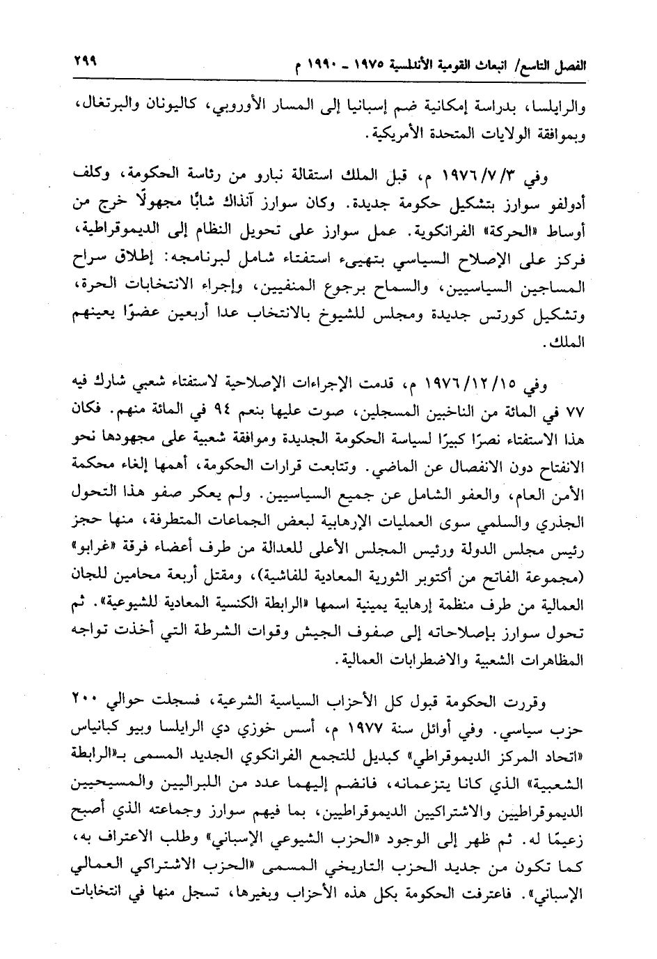 وفي 3/ 7 / 1976 م، قبل الملك استقالة نبارو من رئاسة الحكومة، وكلف أدولفو سوارز بتشكيل حكومة جديدة. وكان سوارز آنذاك شابًّا مجهولاً خرج من أوساط "الحركة" الفرانكوية. عمل سوارز على تحويل النظام إلى الديموقراطية، فركز على الإصلاح السياسي بتهيىء استفتاء شامل لبرنامجه: إطلاق سراح المساجين السياسيين، والسماح برجوع المنفيين، وإجراء الانتخابات الحرة، وتشكيل كورتس جديدة ومجلس للشيوخ بالانتخاب عدا أربعين عضوًا يعينهم الملك.