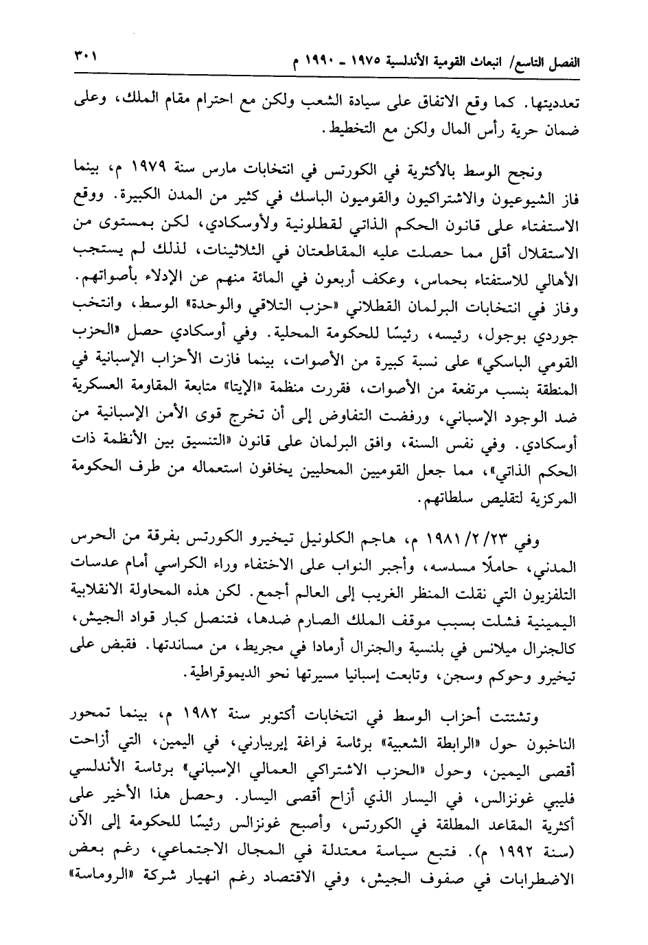 وفي 23/ 2/ 1981 م، هاجم الكلونيل تيخيرو الكورتس بفرقة من الحرس المدني، حاملاً مسدسه، وأجبر النواب على الاختفاء وراء الكراسي أمام عدسات التلفزيون التي نقلت المنظر الغريب إلى العالم أجمع. لكن هذه المحاولة الانقلابية اليمينية فشلت بسبب موقف الملك الصارم ضدها، فتنصل كبار قواد الجيش، كالجنرال ميلانس في بلنسية والجنرال أرمادا في مجريط، من مساندتها. فقبض على تيخيرو وحوكم وسجن، وتابعت إسبانيا مسيرتها نحو الديموقراطية.