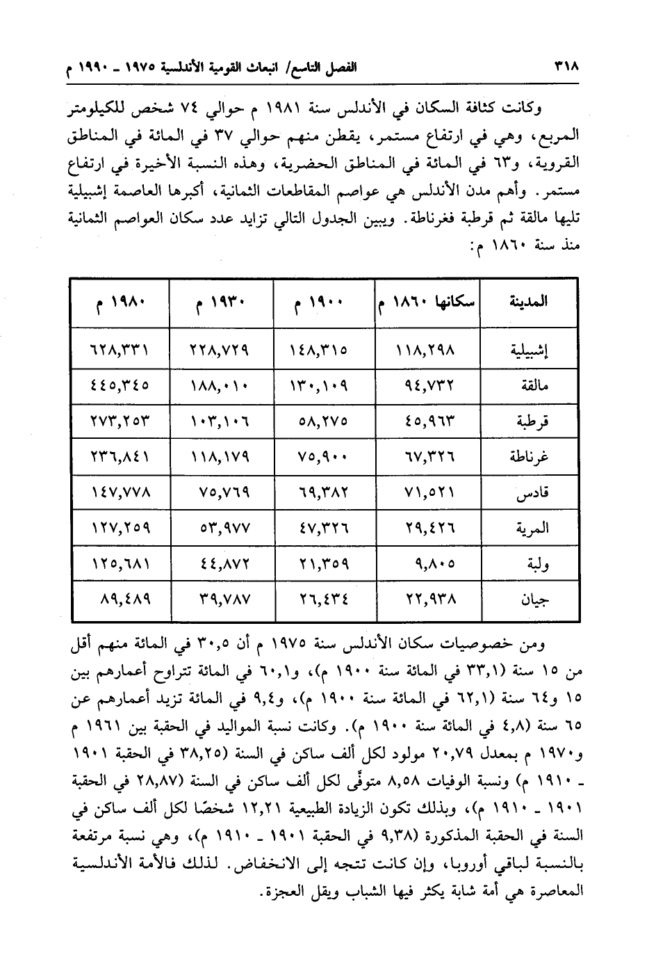 وكانت كثافة السكان في الأندلس سنة 1981 م حوالي 74 شخص للكيلومتر المربع، وهي في ارتفاع مستمر، يقطن منهم حوالي 37 في المائة في المناطق القروية، و 63 في المائة في المناطق الحضرية، وهذه النسبة الأخيرة في ارتفاع مستمر. وأهم مدن الأندلس هي عواصم المقاطعات الثمانية، أكبرها العاصمة إشبيلية تليها مالقة ثم قرطبة فغرناطة. ويبين الجدول التالي تزايد عدد سكان العواصم الثمانية منذ سنة 1860 م: