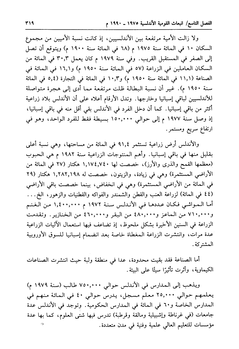 ولا زالت الأمية مرتفعة بين الأندلسيين، إذ كانت نسبة الأميين من مجموع السكان 10 في المائة سنة 1975 م (68 في المائة سنة 1900 م) ويتوقع أن تصل إلى الصفر في المستقبل القريب. وفي سنة 1979 م كان يعمل 30.3 في المائة من السكان العاملين في الزراعة (57 في المائة سنة 1950 م) و 16.1 في المائة في الصناعة (11.1 في المائة سنة 1950 م) و 10.3 في المائة في التجارة (5.4 في المائة سنة 1950 م). غير أن نسبة البطالة ظلت مرتفعة مما أدى إلى هجرة متواصلة للأندلسيين لباقي إسبانيا وخارجها. وتدل الأرقام أعلاه على أن الأندلس بلاد زراعية أكثر من باقي إسبانيا. كما أن دخل الفرد في الأندلس بقي أقل منه في باقي إسبانيا، إذ وصل سنة 1977 م إلى حوالي 150.000 بسيطة فقط للفرد الواحد، وهو في ارتفاع سريع ومستمر.
