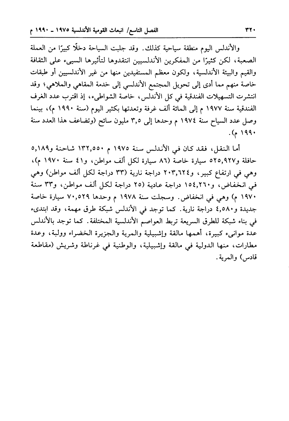 والأندلس اليوم منطقة سياحية كذلك. وقد جلبت السياحة دخلاً كبيرًا من العملة الصعبة، لكن كثيرًا من المفكرين الأندلسيين انتقدوها لتأثيرها السيىء على الثقافة والقيم والبيئة الأندلسية، ولكون معظم المستفيدين منها من غير الأندلسيين أو طبقات خاصة منهم مما أدى إلى تحويل المجتمع الأندلسي إلى خدمة المقاهي والملاهي؛ وقد انتشرت التسهيلات الفندقية في كل الأندلس، خاصة الشواطىء، إذ اقترب عدد الغرف الفندقية سنة 1977 م إلى المائة ألف غرفة وتعدتها بكثير اليوم (سنة 1990 م)، بينما وصل عدد السياح سنة 1974 م وحدها إلى 3.5 مليون سائح (وتضاعف هذا العدد سنة 1990 م).