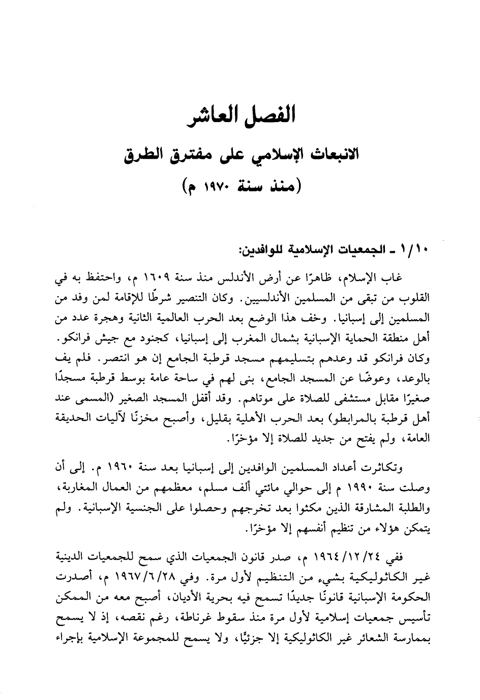 ففي 24/ 12 / 1964 م، صدر قانون الجمعيات الذي سمح للجمعيات الدينية غير الكاثوليكية بشيء من التنظيم لأول مرة. وفي 28/ 6 / 1967 م، أصدرت الحكومة الإسبانية قانونًا جديدًا تسمح فيه بحرية الأديان، أصبح معه من الممكن تأسيس جمعيات إسلامية لأول مرة منذ سقوط غرناطة، رغم نقصه، إذ لا يسمح بممارسة الشعائر غير الكاثوليكية إلا جزئيًّا، ولا يسمح للمجموعة الإسلامية بإجراء