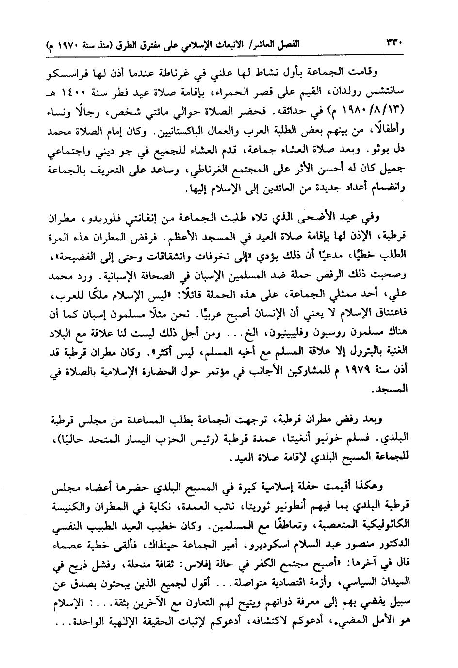 وهكذا أقيمت حفلة إسلامية كبيرة في المسبح البلدي حضرها أعضاء مجلس قرطبة البلدي بما فيهم أنطونيو ثوريتا، نيلاب العمدة، نكاية في المطران والكنيسة الكاثوليكية المتعصبة، وتعاطفًا مع المسلمين. وكان خطيب العيد الطبيب النفسي الدكتور منصور عبد السلام اسوديرو، أمير الجماعة حينذاك، فألقى خطبة عصماء قال في آخرها: "أصبح مجتمع الكفر في حالة إفلاس: ثقافة منحلة، وفشل ذريع في الميدان السياسي، وأزمة اقتصادية متواصلة ... أقول لجميع الذين يبحثون بصدق عن سبيل يفضي بهم إلى معرفة ذواتهم ويتيح لهم التعاون مع الآخرين بثقة ... الإسلام هو الأمل المضيء، أدعوكم لاكتشافه، أدعوكم لإثبات الحقيقة الإلهية الواحدة ...