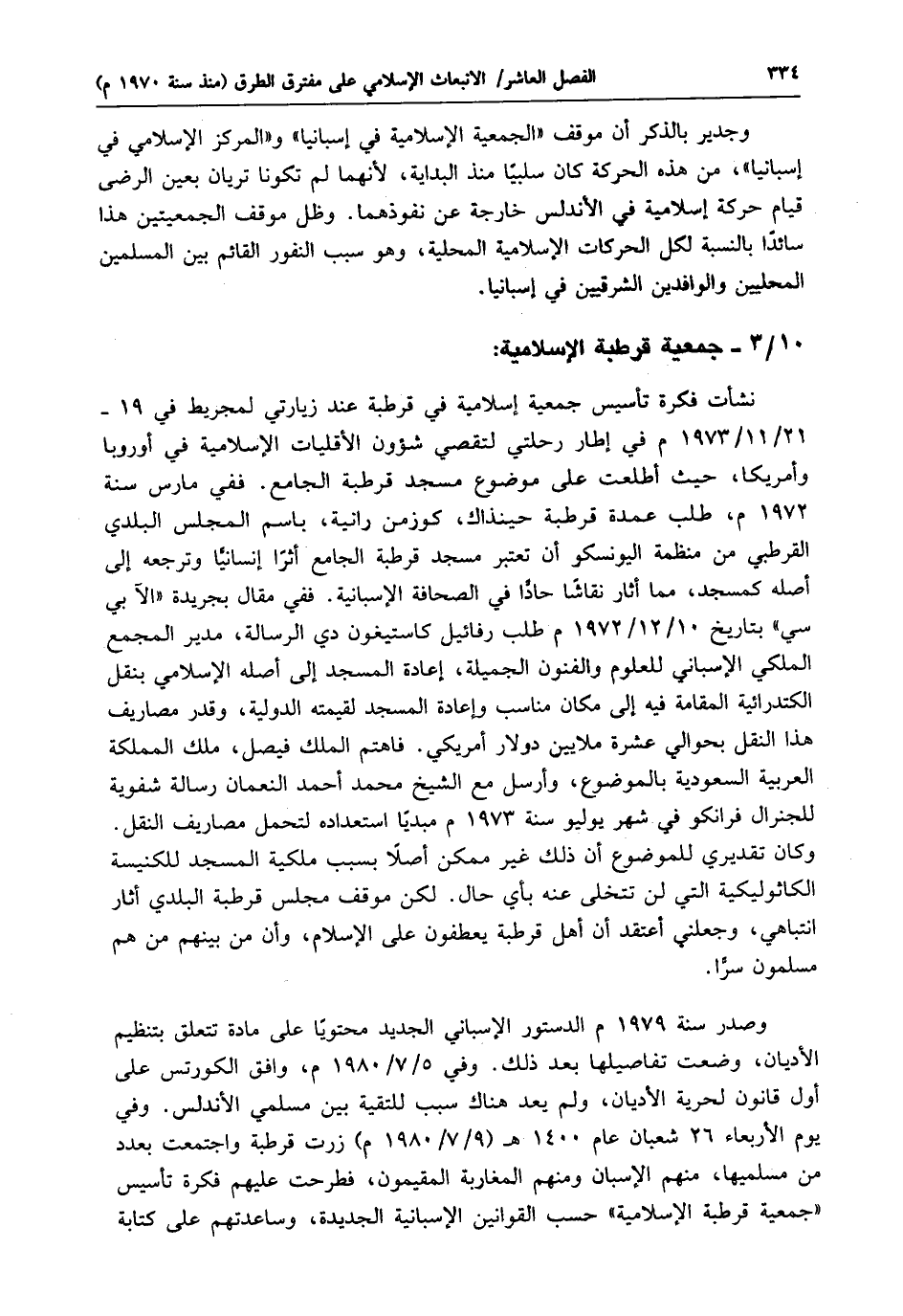 وصدر سنة 1979 م الدستور الإسباني الجديد محتويًا على مادة تتعلق بتنظيم الأديان، وُضعت تفاصيلها بعد ذلك. وفي 5/ 7 / 1980 م، وافق الكورتس على أول قانون لحرية الأديان، ولم يعد هناك سبب للتقية بين مسلمي الأندلس. وفي يوم الأربعاء 26 شعبان عام 1400 هـ (9/ 7 / 1980 م) زرت قرطبة واجتمعت بعدد من مسلميها، منهم الإسبان ومنهم المغاربة المقيمون، فطرحت عليهم فكرة تأسيس "جمعية قرطبة الإسلامية" حسب القوانين الإسبانية الجديدة، وساعدتهم على كتابة