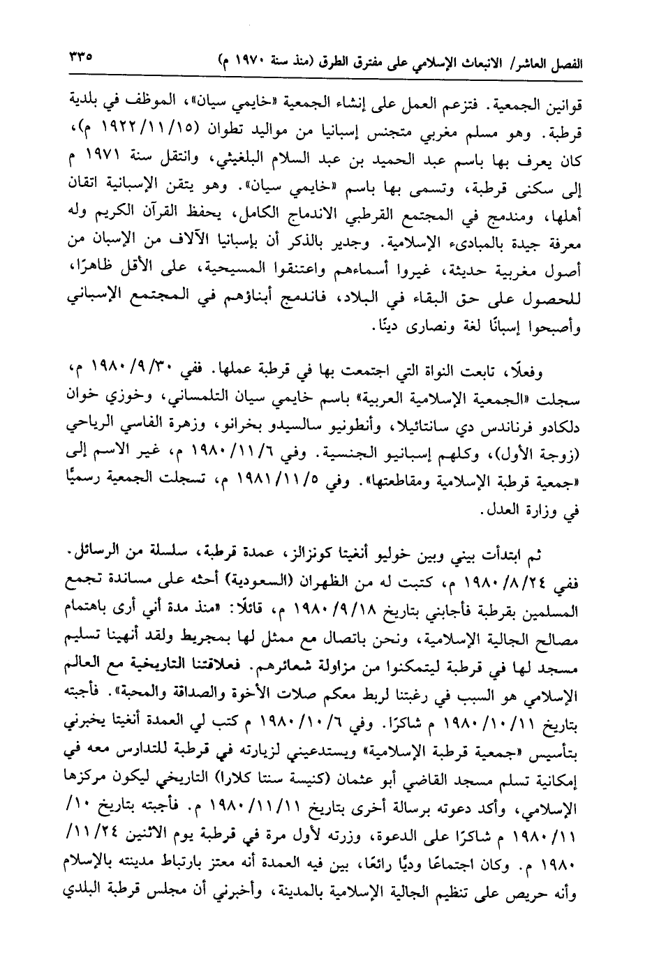 الإسلامي، وأكد دعوته برسالة أخرى بتاريخ 11/ 11 / 1980 م. فأجبته بتاريخ 10/ 11 / 1980 م شاكرًا على الدعوة، وزرته لأول مرة في قرطبة يوم الاشين 24/ 11 / 1980 م. وكان اجتماعًا وديًّا رائعًا، بيّن فيه العمدة أنه معتز بارتباط مدينته بالإسلام وأنه حريص على تنظيم الجالية الإسلامية بالمدينة، وأخبرني أن مجلس قرطبة البلدي