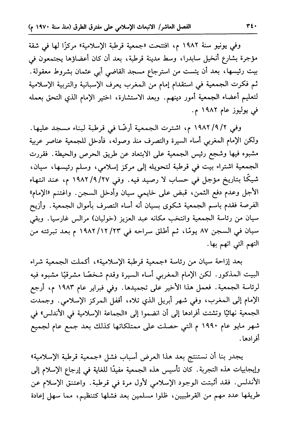 بعد إزاحة سيان من رئاسة "جمعية قرطبة الإسلامية"، أكملت الجمعية شراء البيت المذكور. لكن الإمام المغربي أساء السيرة وقدم شخصًا مشرقيًّا مشبوه فيه لرئاسة الجمعية. فعمل هذا الأخير على تجميدها. وفي فبراير عام 1983 م، أُرجع الإمام إلى المغرب، وفي شهر أبريل الذي تلاه، أُقفل المركز الإسلامي. وجمدت الجمعية نهائيًّا وتشتت أفرادها إلى أن انضموا إلى "الجماعة الإسلامية في الأندلس" في شهر مايو عام 1990 م التي حصلت على ممتلكاتها كذلك بعد جمع عام لجميع أفرادها.