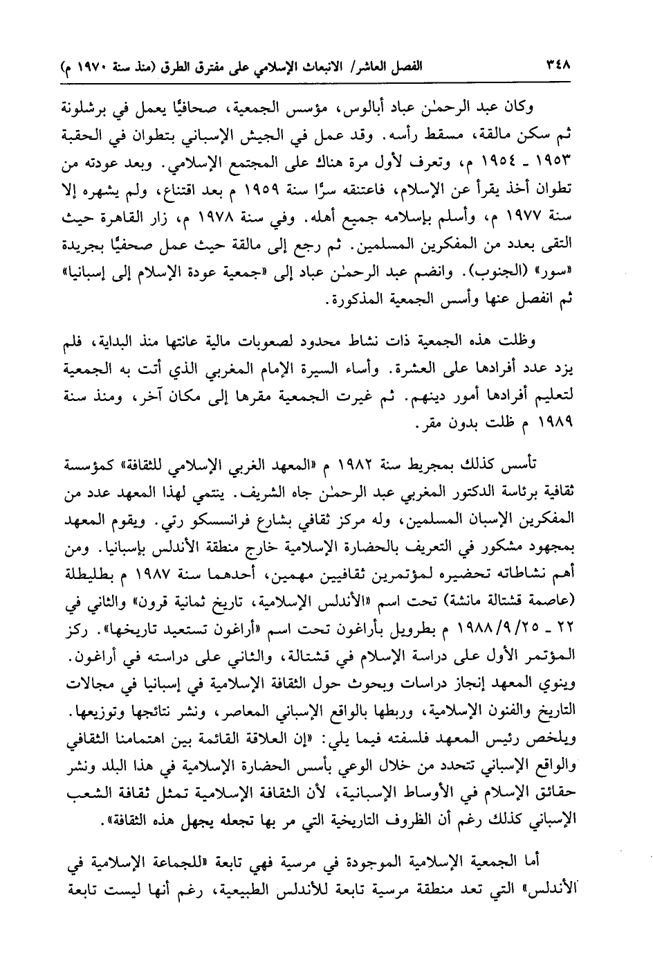 تأسس كذلك بمجريط سنة 1982 م "المعهد الغربي الإسلامي للثقافة" كمؤسسة ثقافية برئاسة الدكتور المغربي عبد الرحمن جاه الشريف. ينتمي لهذا المعهد عدد من المفكرين الإسبان المسلمين، وله مركز ثقافي بشارع فرانسسكو رتي. ويقوم المعهد بمجهود مشكور في التعريف بالحضارة الإسلامية خارج منطقة الأندلس بإسبانيا. ومن أهم نشاطاته تحضيره لمؤتمرين ثقافيين مهمين، أحدهما سنة 1987 م بطليطلة (عاصمة قشتالة مانشة) تحت اسم "الأندلس الإسلامية، تاريخ ثمانية قرون" والثاني في 22 - 25/ 9/ 1988 م بطرويل بأراغون تحت اسم "أراغون تستعيد تاريخها". ركز المؤتمر الأول على دراسة الإسلام في قشتالة، والثاني على دراسته في أراغون. وينوي المعهد إنجاز دراسات وبحوث حول الثقافة الإسلامية في إسبانيا في مجالات التاريخ والفنون الإسلامية، وربطها بالواقع الإسباني المعاصر، ونشر نتائجها وتوزيعها.