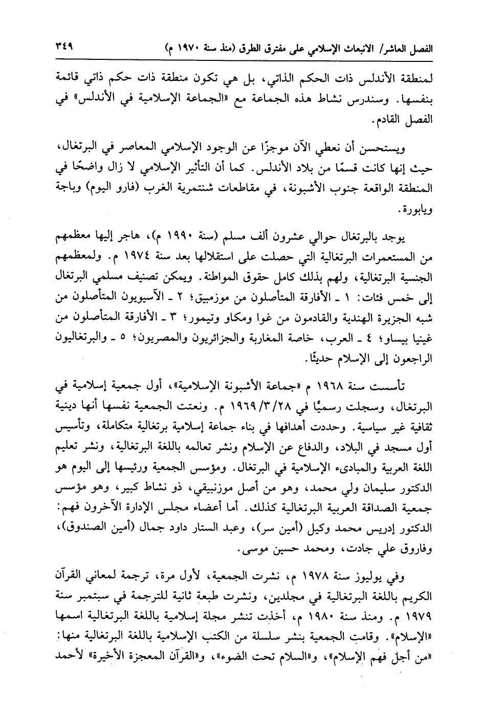 ويُستحسن أن نعطي الآن موجزًا عن الوجود الإسلامي المعاصر في البرتغال، حيث إنها كانت قسمًا من بلاد الأندلس. كما أن التأثير الإسلامي لا زال واضحًا في المنطقة الواقعة جنوب الأشبونة، في مقاطعات شنتمرية الغرب (فارو اليوم) وباجة ويابورة.