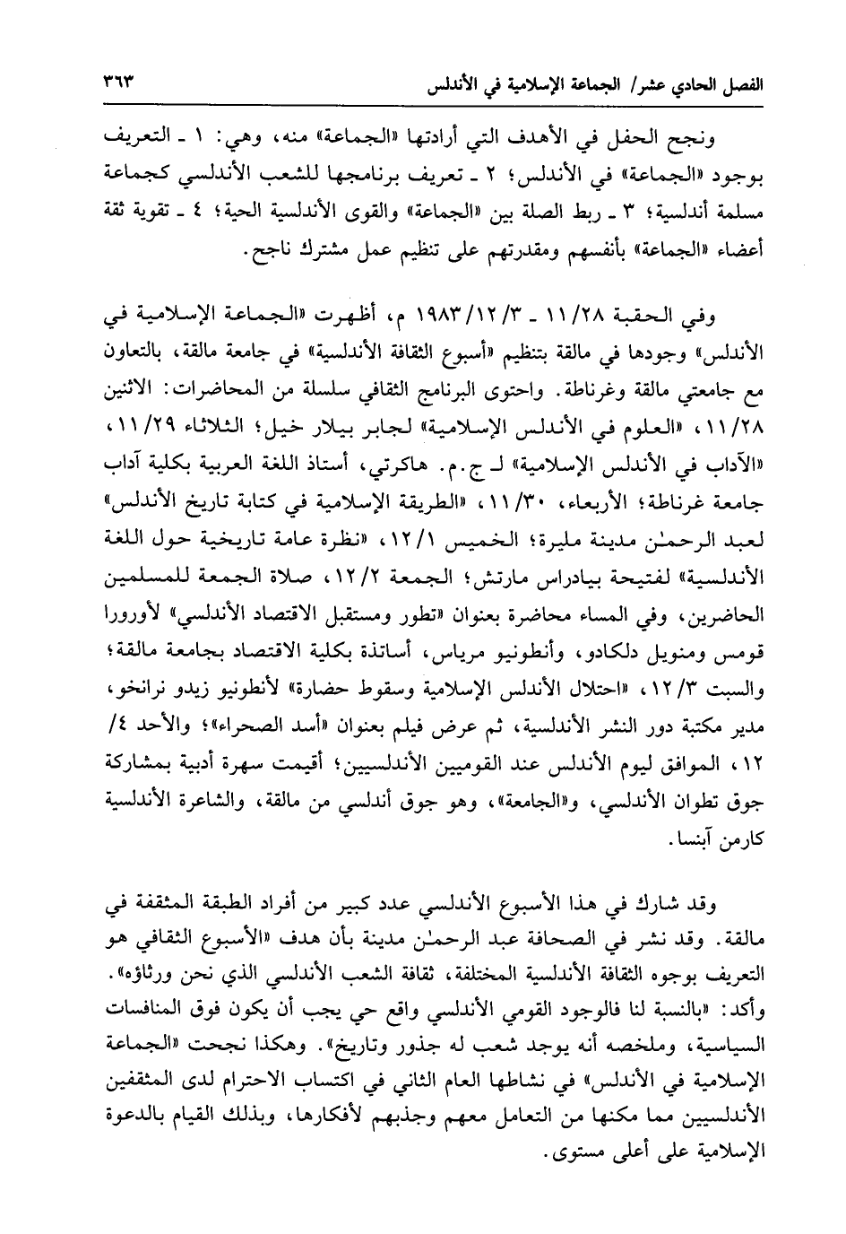 وفي الحقبة 28/ 11 - 3/ 12/ 1983 م، أظهرت "الجماعة الإسلامية في الأندلس" وجودها في مالقة بتنظيم "أسبوع الثقافة الأندلسية" في جامعة مالقة، بالتعاون مع جامعتي مالقة وغرناطة. واحتوى البرنامج الثقافي سلسلة من المحاضرات: الاثنين 28/ 11، "العلوم في الأندلس الإسلامية" لجابر بيلار خيل؛ الثلاثاء 29/ 11، "الآداب في الأندلس الإسلامية" لـ ج. م. هاكرتي، أستاذ اللغة العربية بكلية آداب جامعة غرناطة؛ الأربعاء، 30/ 11، "الطريقة الإسلامية في كتابة تاريخ الأندلس" لعبد الرحمن مدينة مليرة؛ الخميس 1/ 12، "نظرة عامة تاريخية حول اللغة الأندلسية" لفتيحة بيادراس مارتش؛ الجمعة 2/ 12، صلاة الجمعة للمسلمين الحاضرين، وفي المساء محاضرة بعنوان "تطور ومستقبل الاقتصاد الأندلسي" لأورورا قومس ومنويل دلكادو، وأنطونيو مرياس، أساتذة بكلية الاقتصاد بجامعة مالقة؛ والسبت 3/ 12، "احتلال الأندلس الإسلامية وسقوط حضارة" لأنطونيو زيدو نرانخو، مدير مكتبة دور النشر الأندلسية، ثم عرض فيلم بعنوان "أسد الصحراء"؛ والأحد 4/ 12، الموافق ليوم الأندلس عند القوميين الأندلسيين؛ أقيمت سهرة أدبية بمشاركة جوق تطوان الأندلسي، و"الجامعة"، وهو جوق أندلسي من مالقة، والشاعرة الأندلسية كارمن آبنسا.